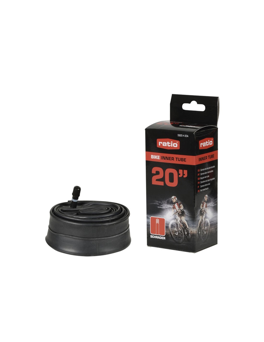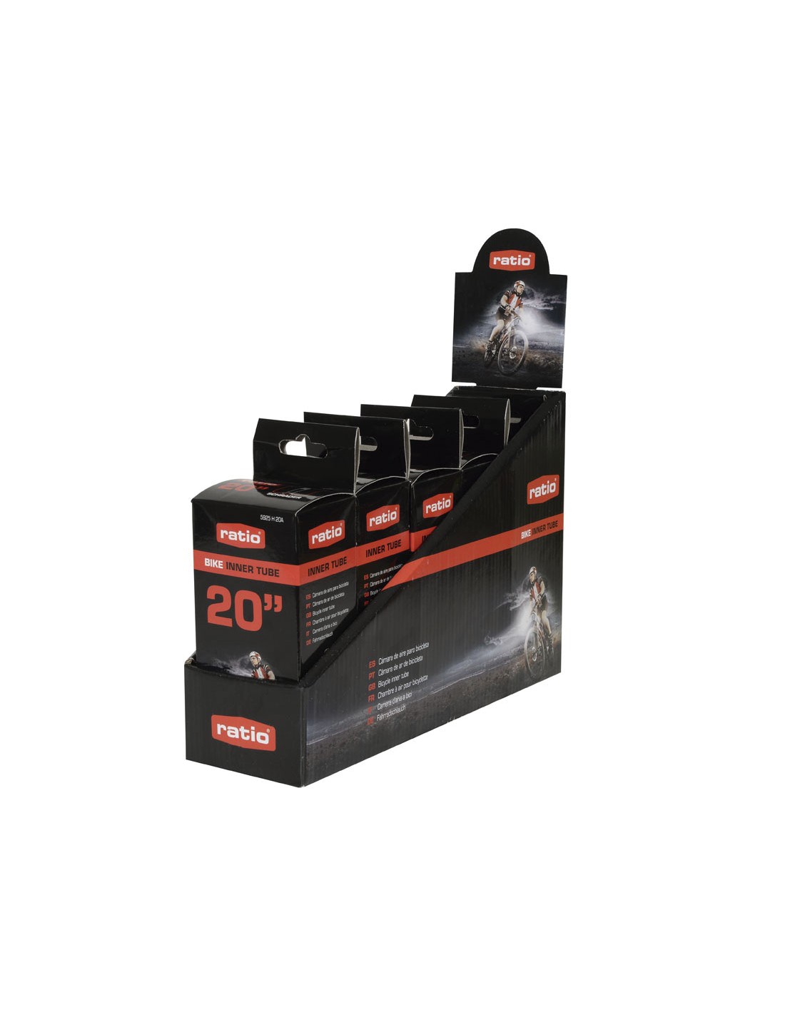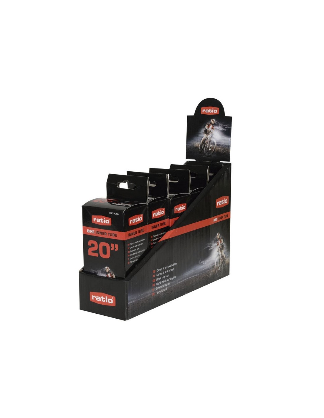 Cámara rueda bicicletas RATIO Caucho, balón ø 1,75/2,125". Válvula latón tipo Schrader o Presta según modelo. Caja display 5 unidades. 20\". Schrader.