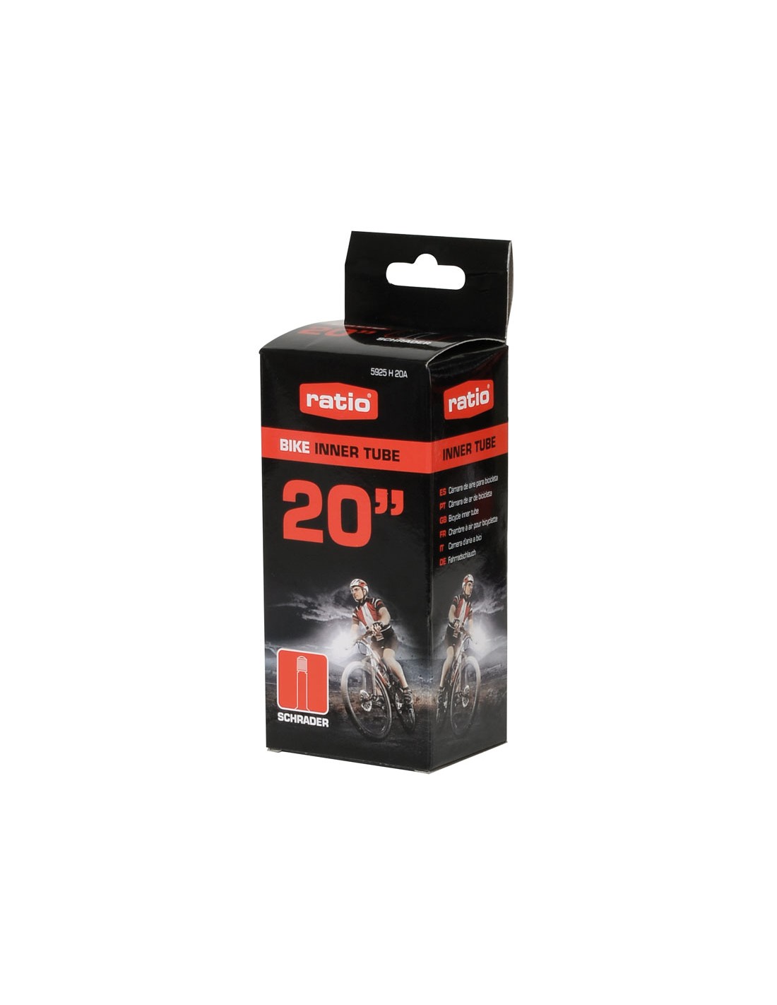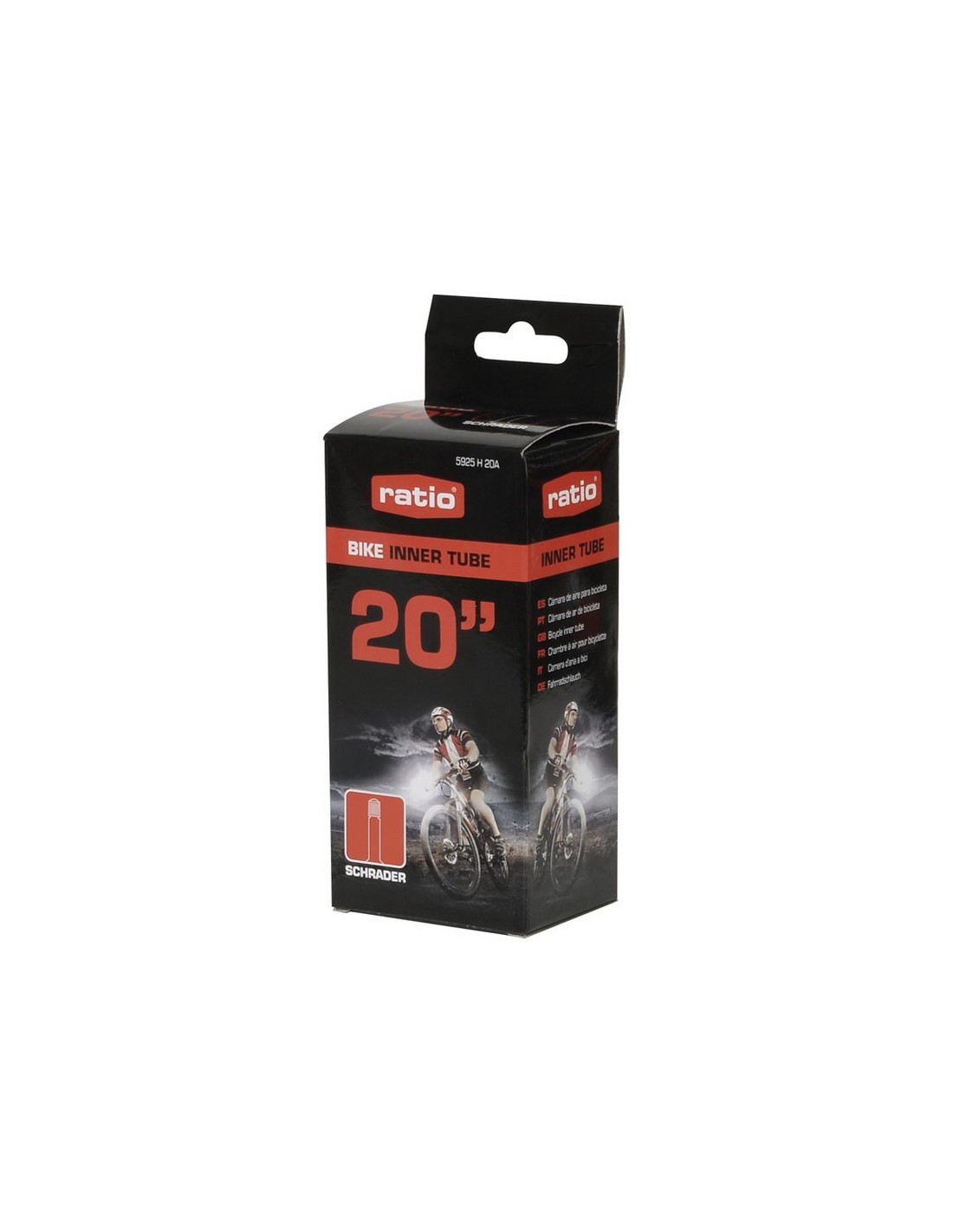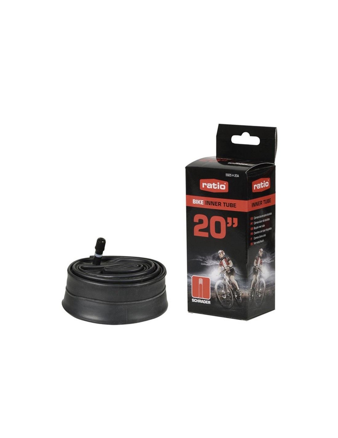 Cámara rueda bicicletas RATIO Caucho, balón ø 1,75/2,125". Válvula latón tipo Schrader o Presta según modelo. Caja display 5 unidades. 20\". Schrader.