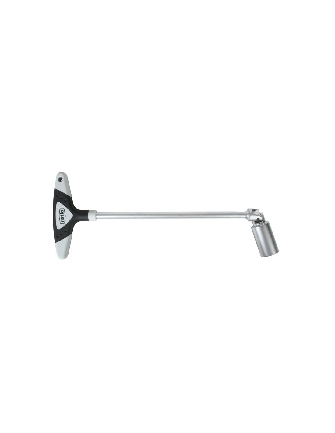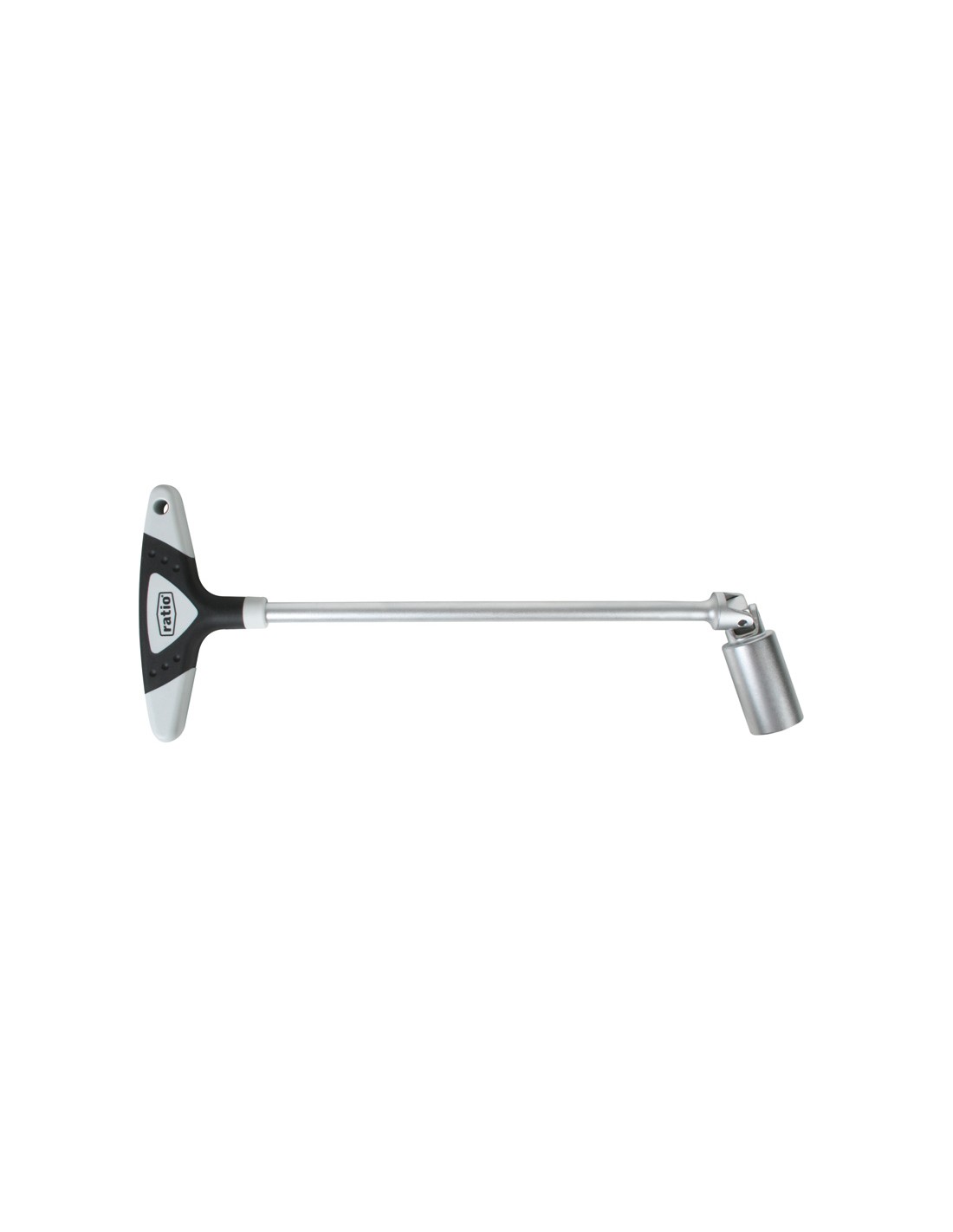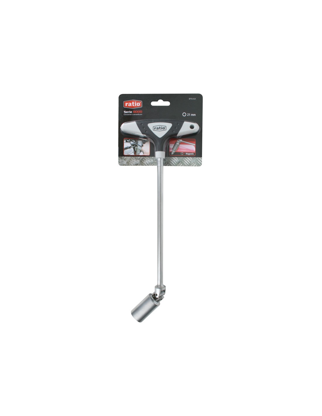 Llave de bujías RATIO Acero cromo-vanadio satinado. Boca hexagonal magnética. Brazo articulado 295 mm. Mango bimaterial antideslizante. 21x295 mm.