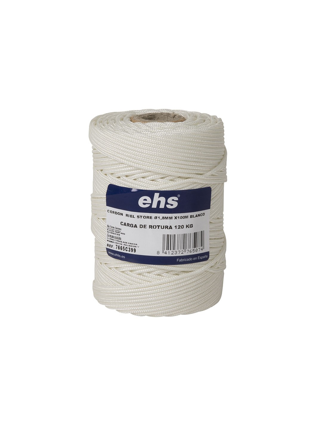 Cordón rieles de cortina EHS. Cuerda poliamida trenzada. Compuesto anti-UVA. Aplicaciones: cortinas, decoración, trabajos manuales, etc. ø 1,8 mm x 100 m. Blanco.