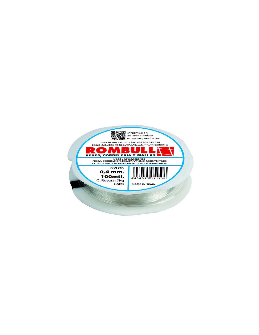 Hilo nilón ROMBULL Monofilamento nilón de alta resistencia. Apliaciones: Pesca, decoración, escaparatismo, usos textiles. ø 0,35 mm x 100 m.