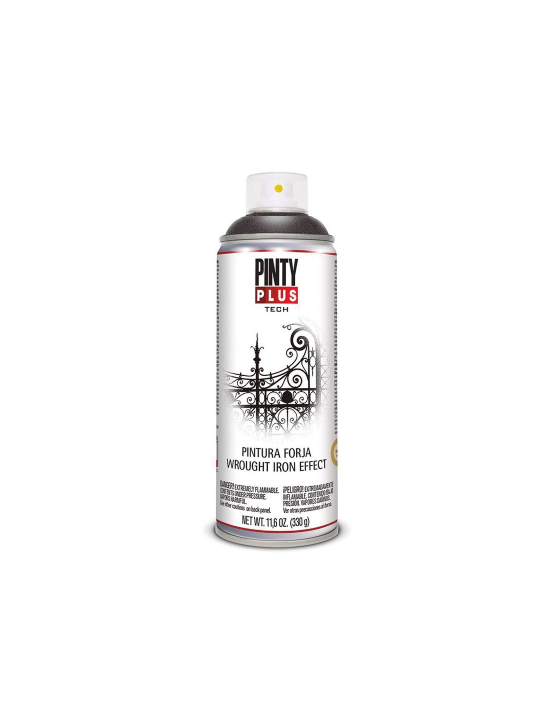 Pintura spray acabado forja PINTYPLUS Dos en uno, imprimación y pintura forja. Además de las propiedades de una imprimación en cuanto a anclaje y poder antioxidante, acabado extra mate, grueso y duro que produce un efecto de hierro antiguo. Resistente a la abrasión. Excelente durabilidad a la intemperie. Repintado 30 min. 400 ml. Negra.