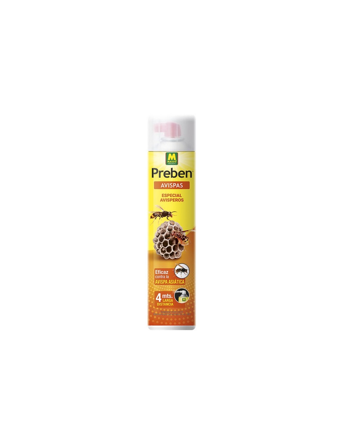 Insecticida avisperos MASSÓ Elimina el nido, acción inmediata. Pulveriza a una distancia de 4 m. Válida contra avista Velutina (asiática). A base de praletrina, un piretroide dotado con elevado efecto derribo y mortalidad sobre avispas y avispones. 750 ml.