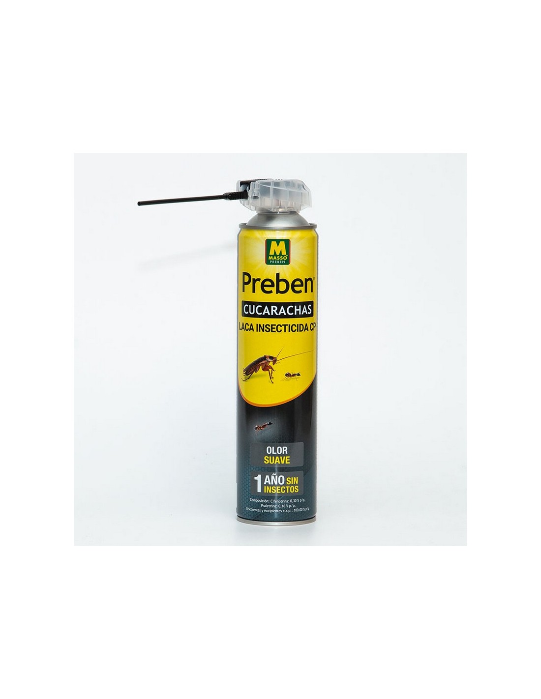 Insecticida laca rastreros MASSÓ Preben. Laca insecticida en aerosol indicada para control de cucarachas, hormigas, arañas y demás insectos rastreros. Efecto inmediato y duración prolongada gracias a sus resinas que protegen la materia activa. 600 cc.