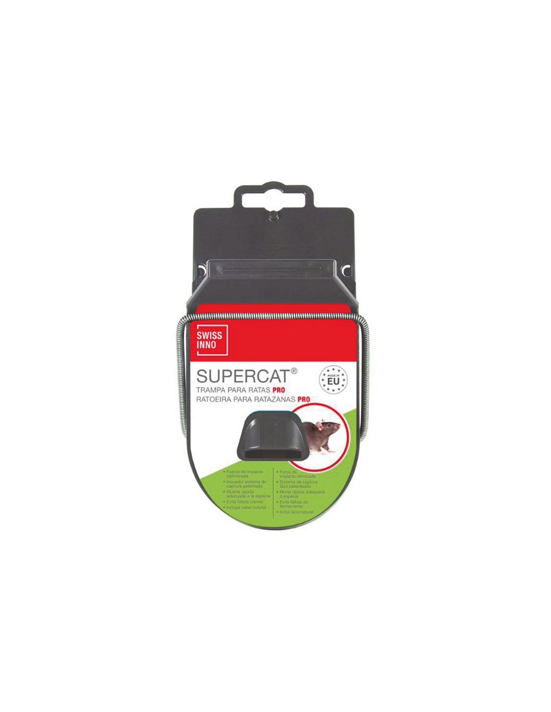 Ratonera SWISSINNO Supercat Pro Sin pesticidas, respetuosa con el mediop ambiente. Cumple con los futuros estándares de la UE y alcanzo la clasificación más alta de categoría A según el acuerdo "International Humane Trapping Standards" (AIHTS). Para ratas.