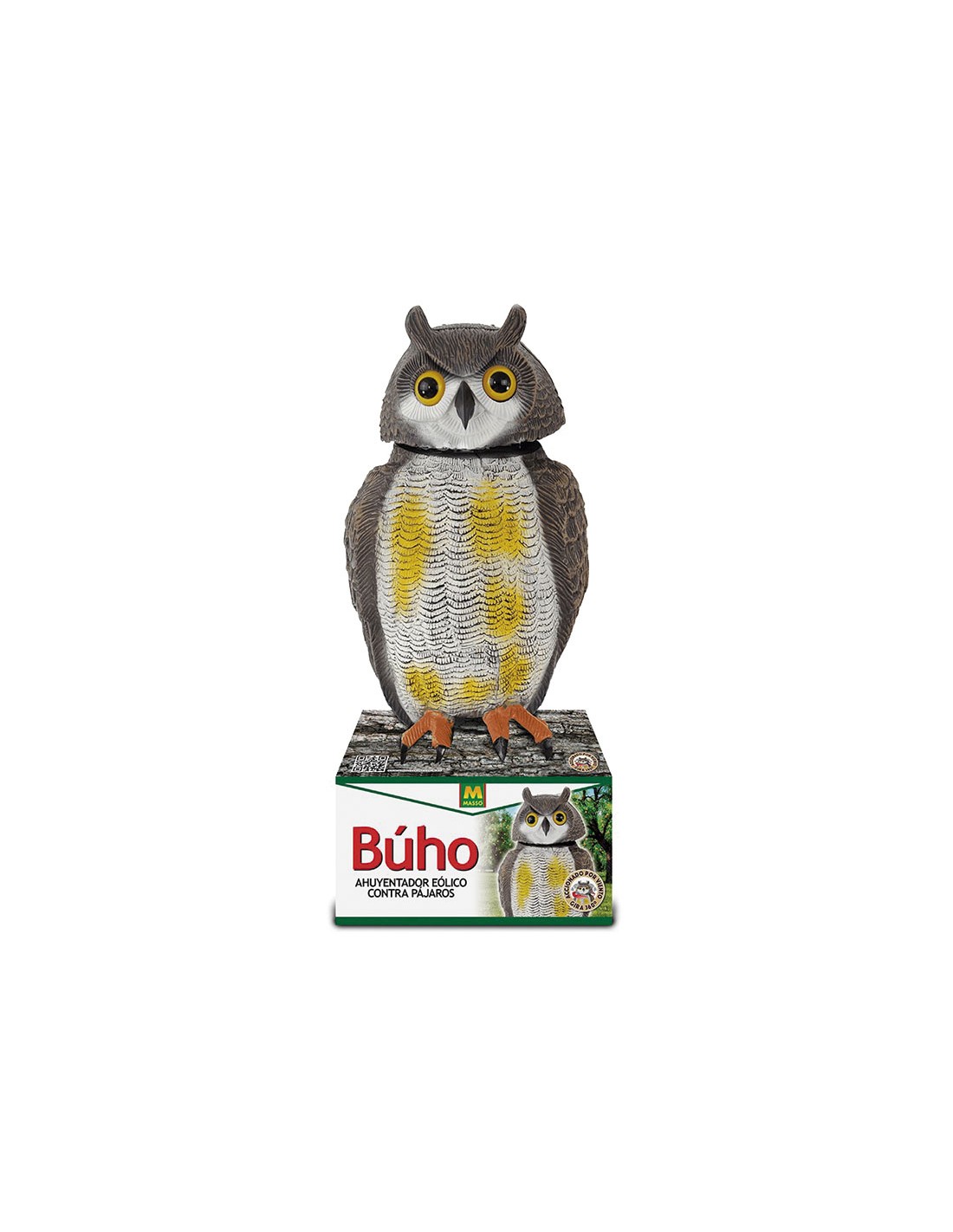 Ahuyentador pájaros MASSÓ Búho eólico fabricado en PVC. Dispone de un mecanismo interior que mueve la cabeza gracias a la acción del viento. Protege balcones, jardines frutales, embarcaciones, etc. 18,x17xh.40 cm.