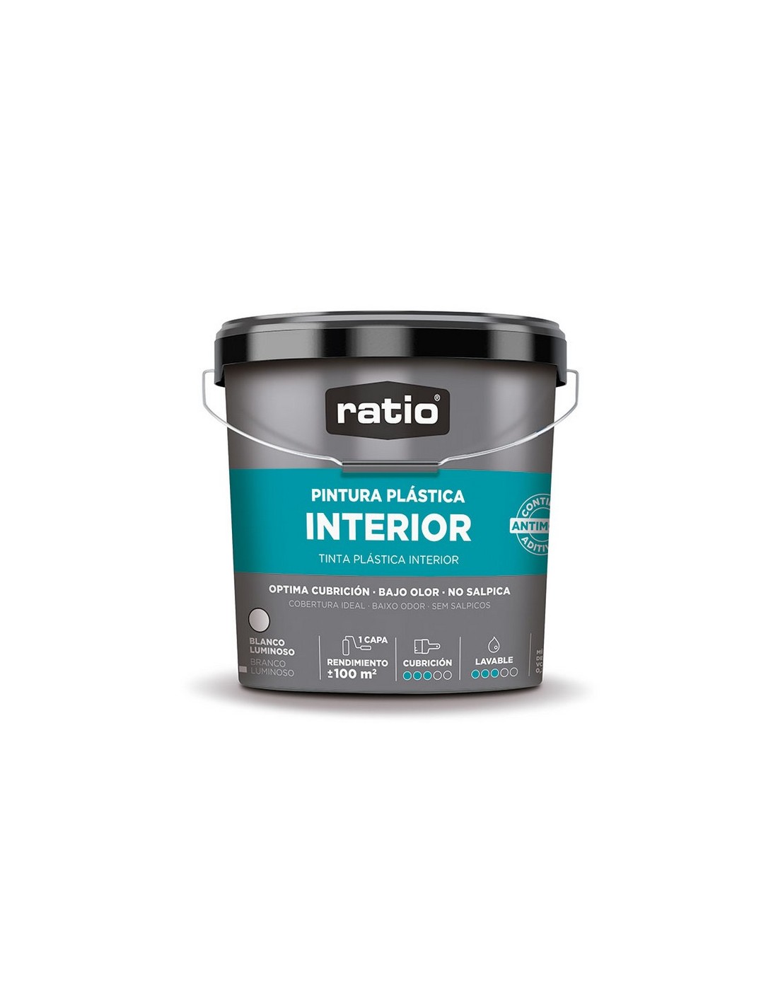 Pintura plástica interior RATIO Pintura plástica de olor suave para interiores. Antimoho y lavable. Rendimiento: hasta 7 m2/l, secado al tacto: 1h, repintado: 4h. Ideal para todo tipo de superfícies de interiores y techos. Especialmente indicada para trasteros, sótanos y parkings. Blanco luminoso. 15 litros.