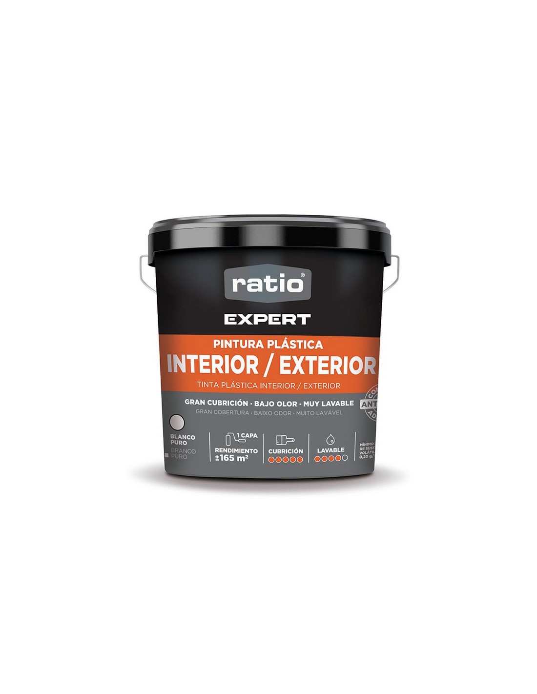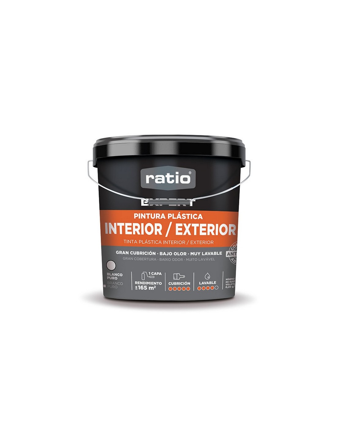 Pintura plástica interior-exterior RATIO Expert Pintura plástica de olor suave interiores. Antimoho y lavable. Rendimiento: hasta 11 m2/l, secado al tacto: 1 h, repintado: 6 h. Ideal para todo tipo de superfícies en interiores y techos, ofreciendo un acabado de alta calidad. Más rendimiento en menos horas de trabajo: Resultado de alta calidad. Blanco puro. 15 litros.