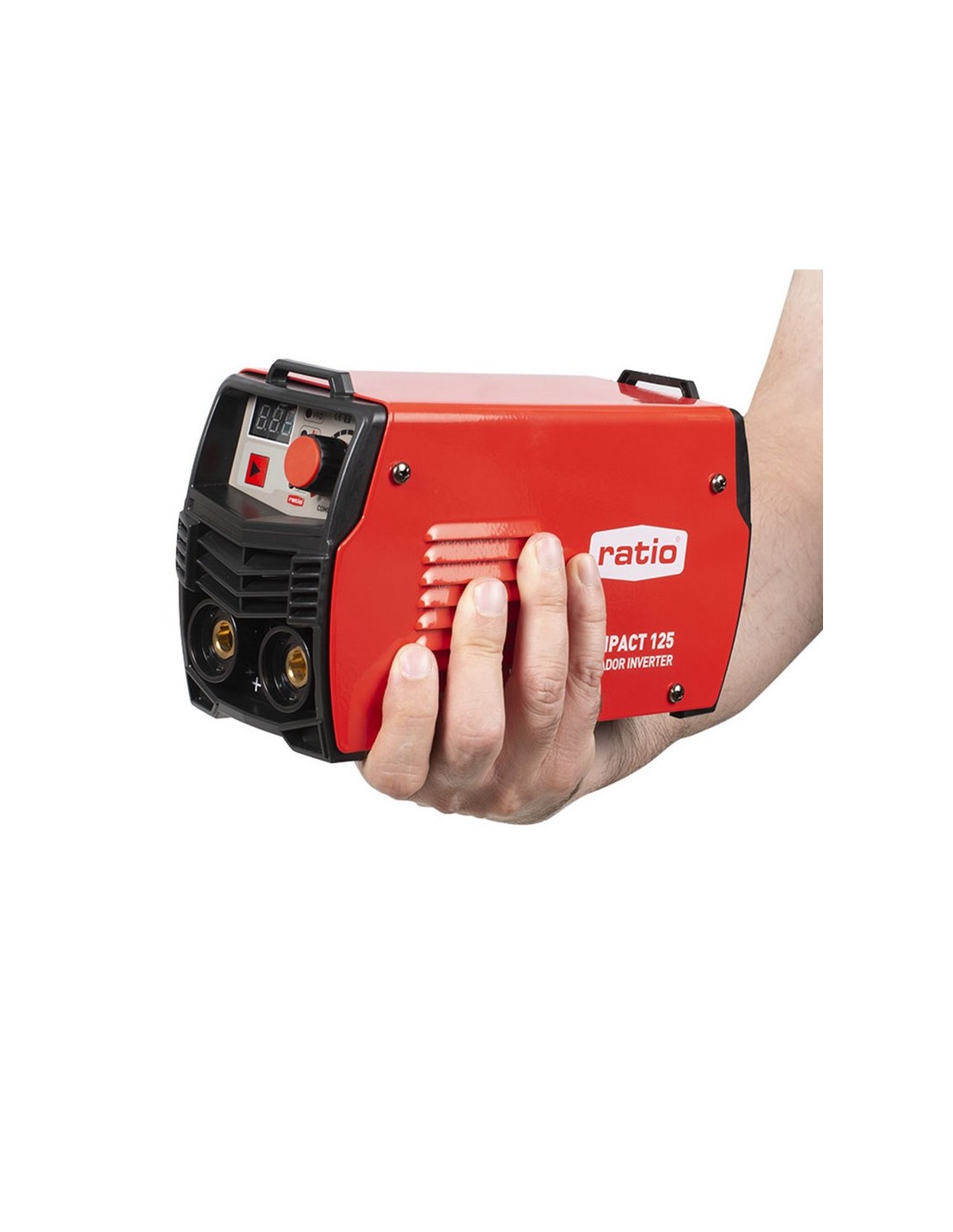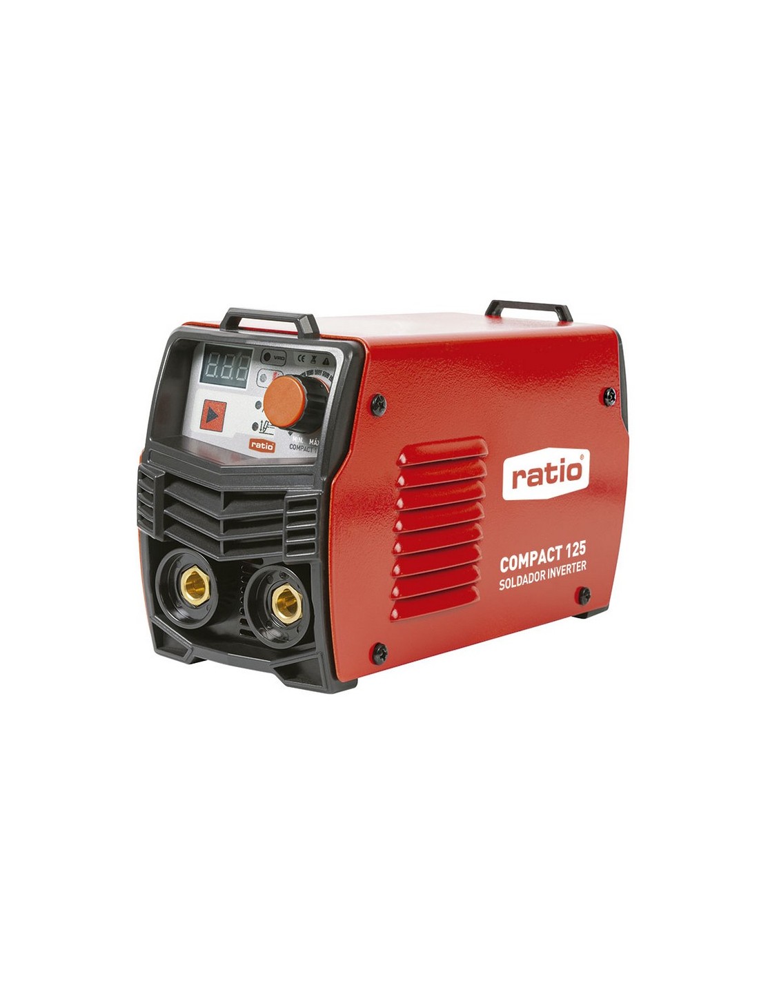 Minisoldador inverter RATIO Compact 125 Monofásico. Apto para generadores. Protección Hot-Start, Anti-Stick y Arc-Force. Incluye pinzas porta-electrodos y masa, pantalla soldador, piqueta soldador/cepillo. Maletín transporte aluminio. . Rendimiento: 40% (40ºC) - 120 A. 100% (40ºC) - 60 A. Índice protección: IP21. 210x100x137 mm. Potencia: 125 A.