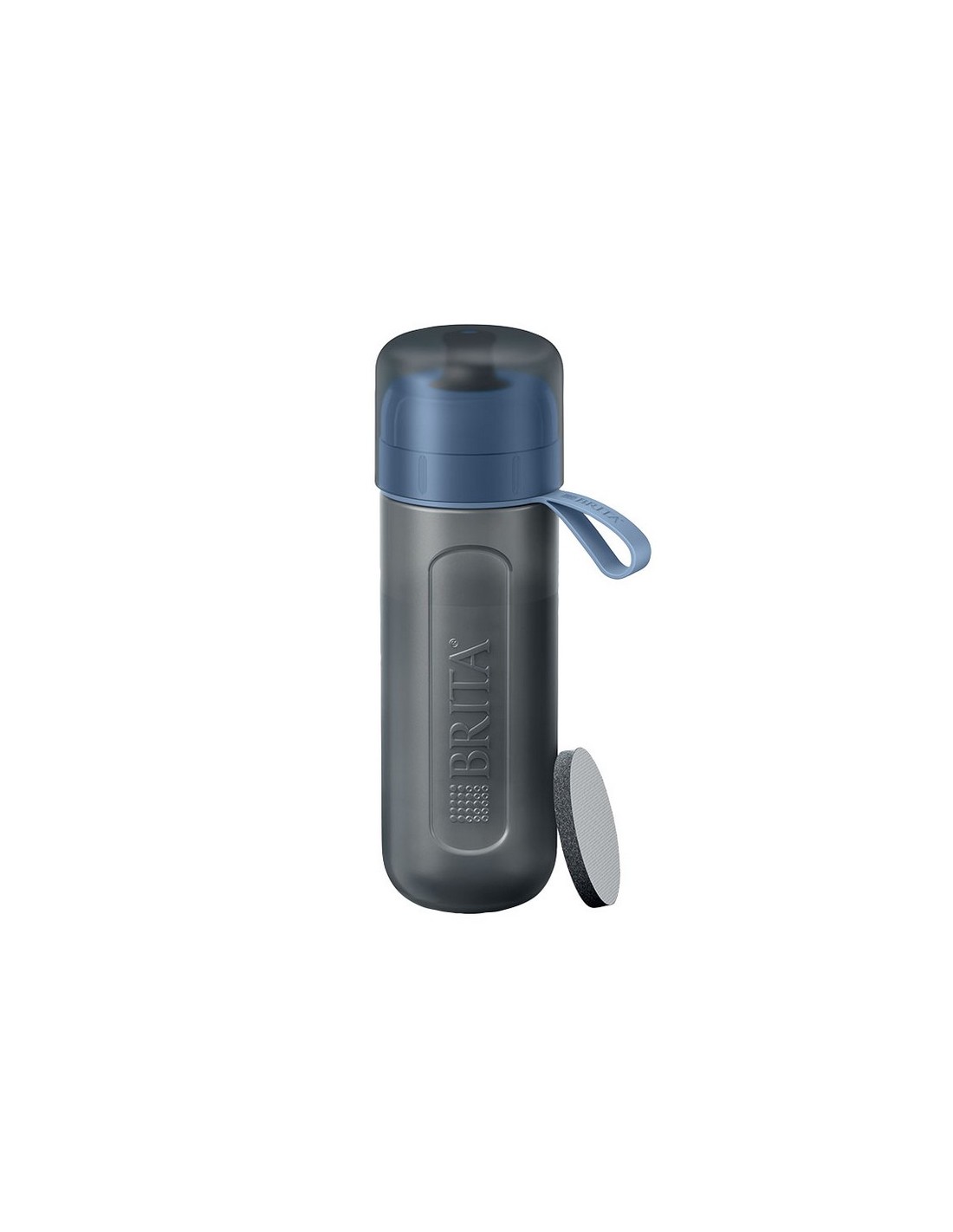 Botella filtrante de agua BRITA Active Incluye 2 MicroDisc, filtro hecho de carbón activado natural procedente de cáscaras de coco, equivalente a 2x4 semanas de capacidad. Filtra el cloro y otras sustancias que afectan al sabor, así como micro partículas y otras impurezas como herbicidas, pesticidas y medicamentos. Botella libre BPA fácil de limpiar y apta para lavavajillas. Reutilizable. 0,6 litros. Color azul.
