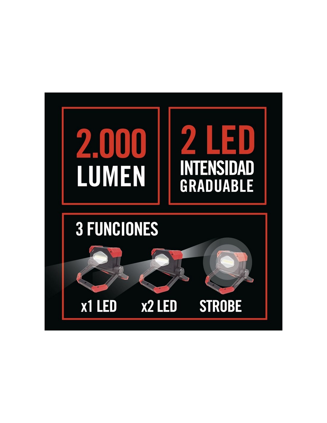 Proyector led recargable RATIO XF-01 Tamaño muy compacto y ligero. Recargable mediante conexión USB. 2 luces Led tipo COB, 2 x 10 W, 1.000 lm. cada una. La batería se puede utilizar también como power bank. Dispone de dos asas que giran 360º para sujetarlo, colgarlo y apoyarlo en diferentes ángulos. Las asas llevan iman para superficies metálicas. 2x10 W.