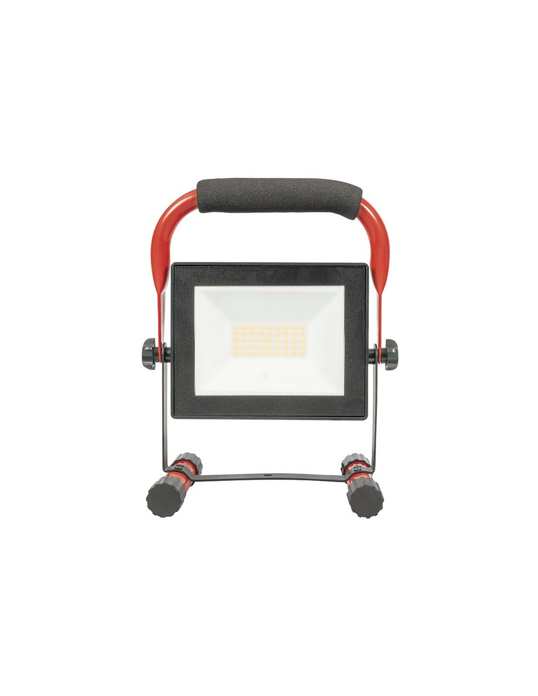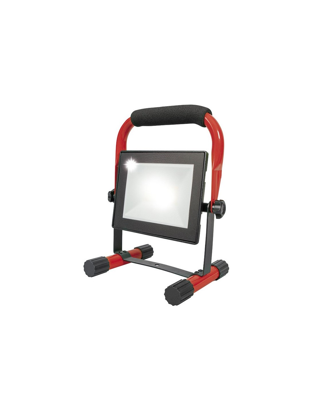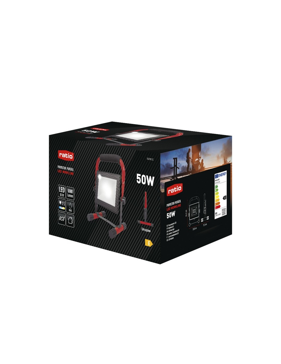Foco proyector Led RATIO WorkLine Color negro con soporte color rojo. Alta potencia. Carcasa de aluminio fundido a presión resistente a la corrosión. Vidrio templado. LED no recambiable. Ángulo de iluminación 120º. Luz día 5000 K. Vida útil 25.000 horas. 1,50 metros de cable. Protección IP65. 1 x 50 W. 5.500 lm.