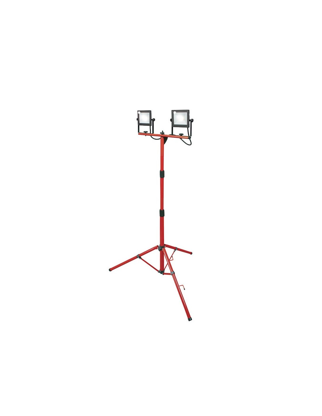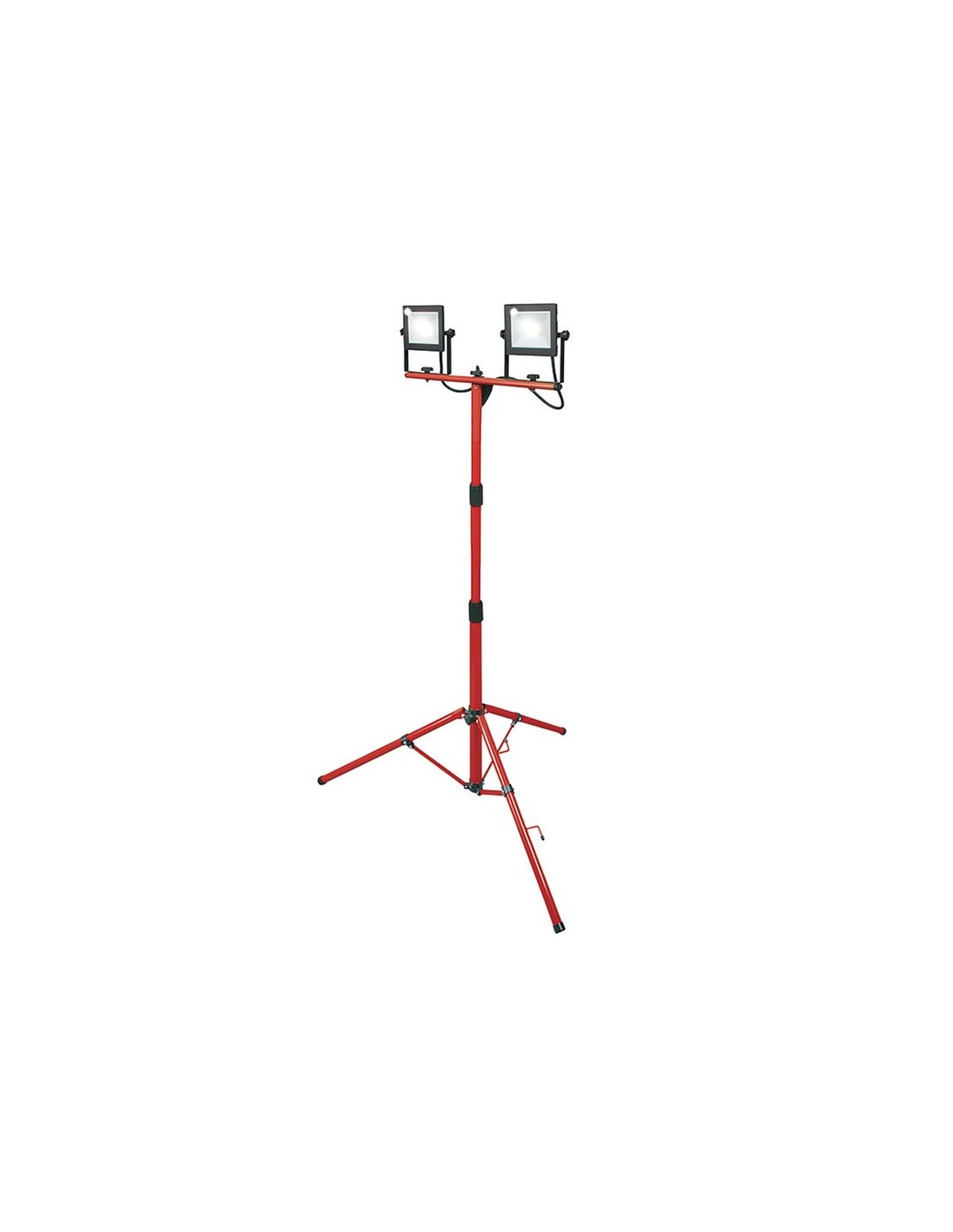 Foco proyector doble Led con trípode RATIO WorkLine Trípode extensible 70/150 cm. color rojo. Alta potencia. Carcasa de aluminio fundido a presión resistente a la corrosión. Vidrio templado. LED no recambiable. Ángulo de iluminación 120º. Luz día 5000 K. Vida útil 25.000 horas. 3 metros de cable. Protección IP65. 2 x 50 W. 11.000 lm.