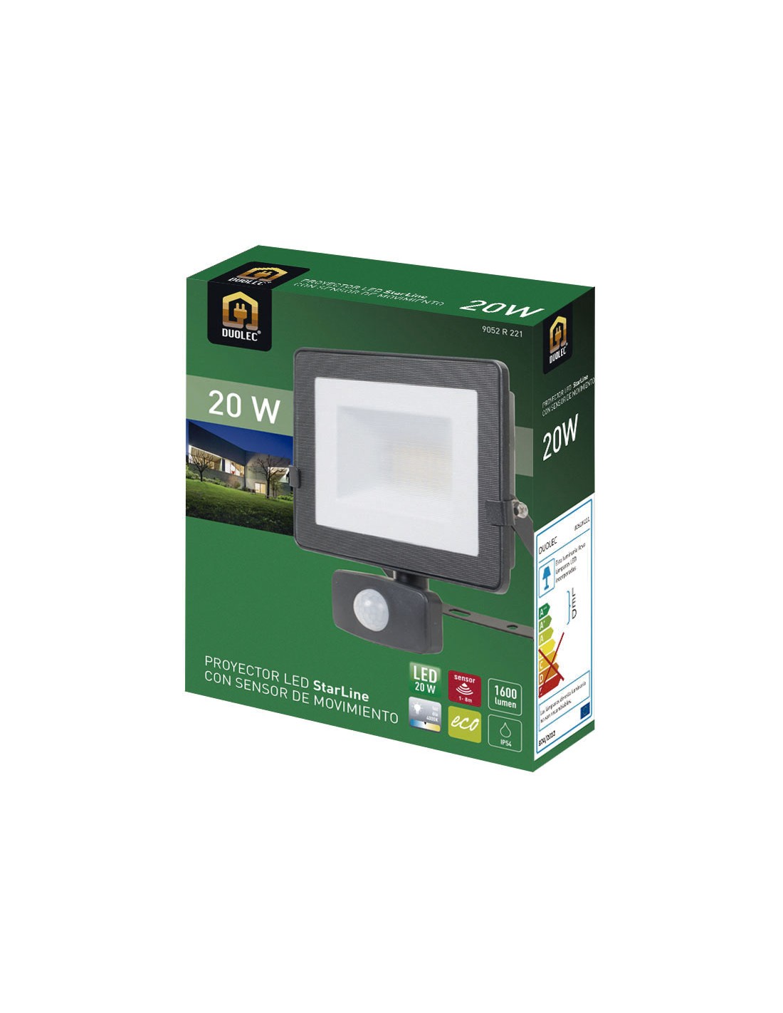 Foco proyector Led DUOLEC Star Line con detector de movimiento. Color negro. Alta potencia. Carcasa de aluminio fundido a presión resistente a la corrosión. Vidrio templado. Led no recambiable. Ángulo de iluminación 120º. Luz día 4000 K. Vida útil 25.000 horas. Protección IP54. 20 W. 1.600 lm. 15x4,2xh.19 cm.