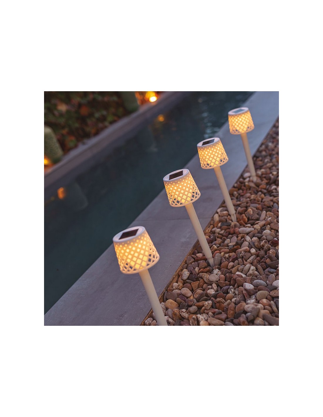 Estacas solares jardín NEW GARDEN Gretita pica Set 4 piezas. ø 9xh.39 cm. Autonomía: 30h. Sensor crepuscular. 3000 °K. 2 lm. IP44. Blanca. 4 unid.