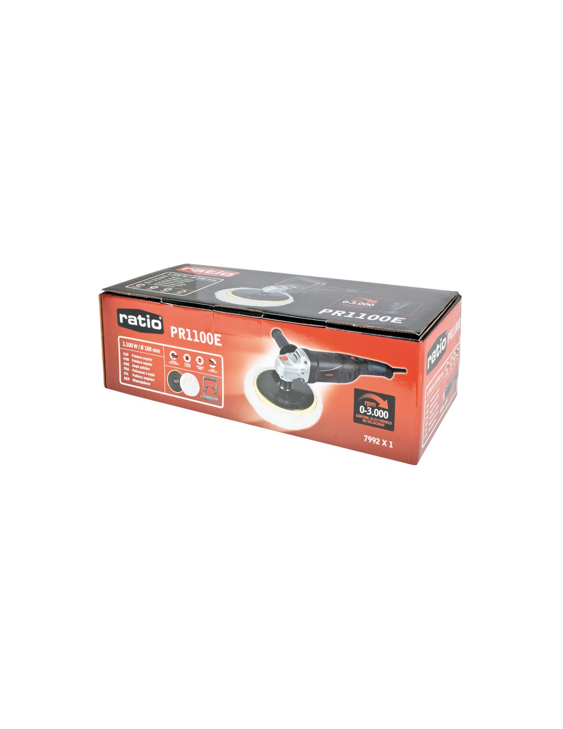 Pulidora angular RATIO PR1100E. Arranque suave y control de velocidad constante. Control electrónico 5 velocidades 0-3.000 rpm. Pantalla LCD selección de velocidad. Botón bloqueo de eje. Plato autoadherente y caperuza de pulido incluida. Empuñadura auxiliar reversible y empuñadura Potencia: 1.100 W.