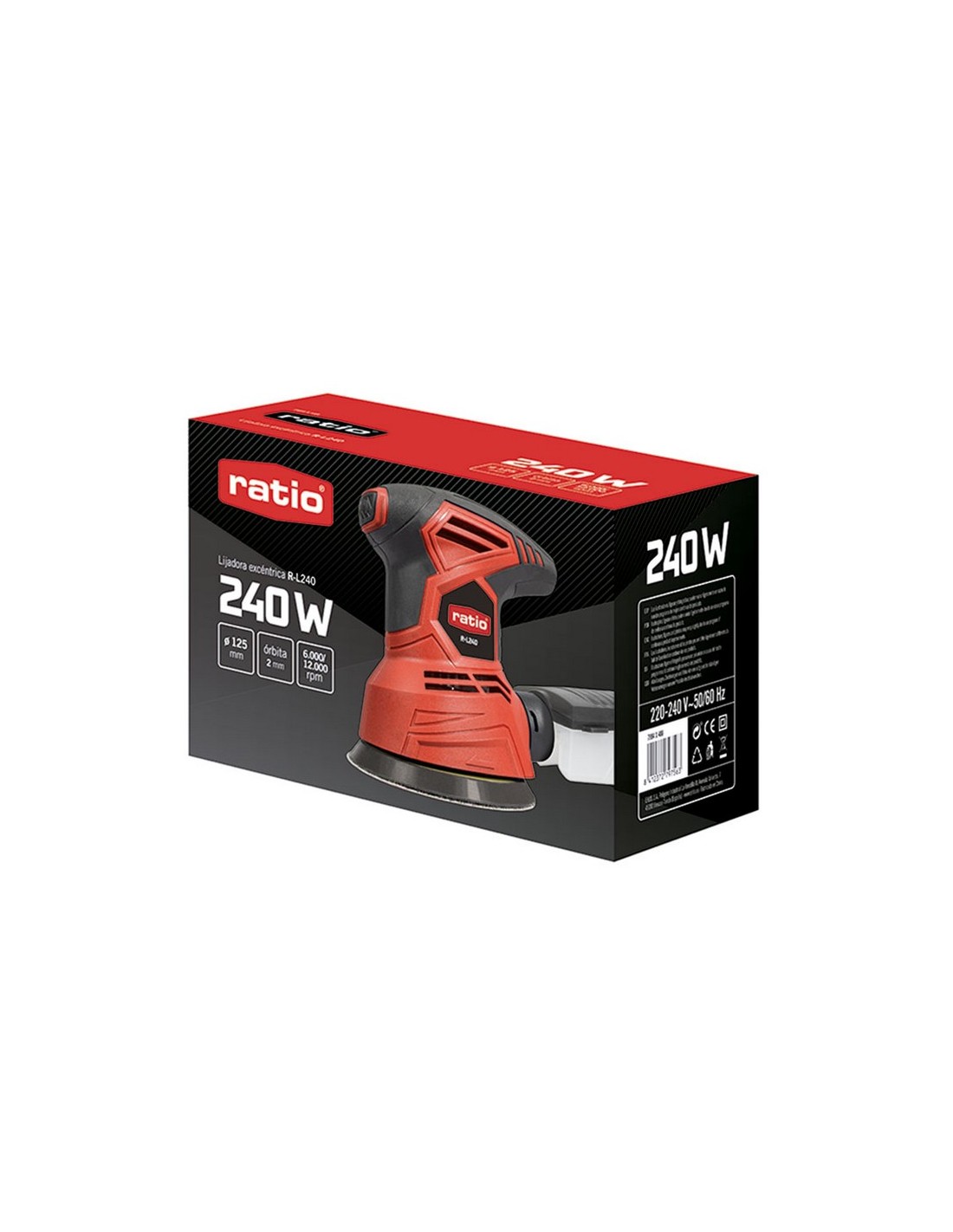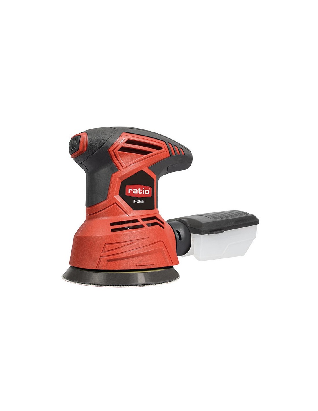 Lijadora rotorbital RATIO R-L240 Potente y ligera. Sistema de aspiración ciclónica. Gran rendimiento de lijado. Velocidad variable. Empuñadura bimaterial. Potencia: 240 W. rpm: 6.000-12.000. ø plato: 125 mm. ø órbita: 2,0 mm.