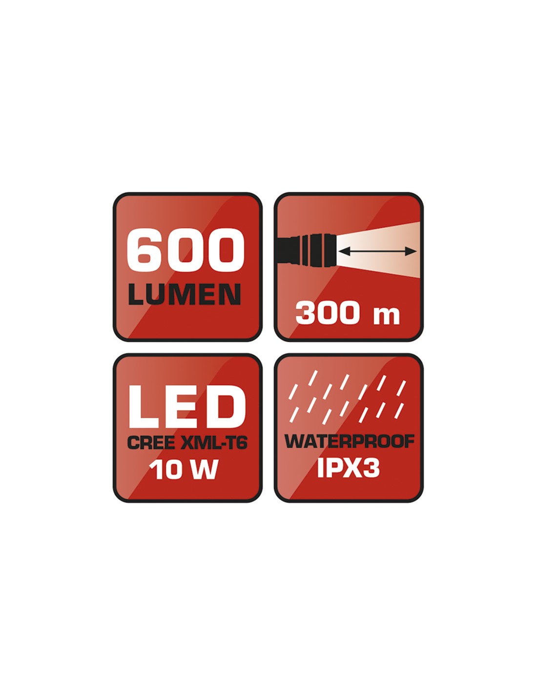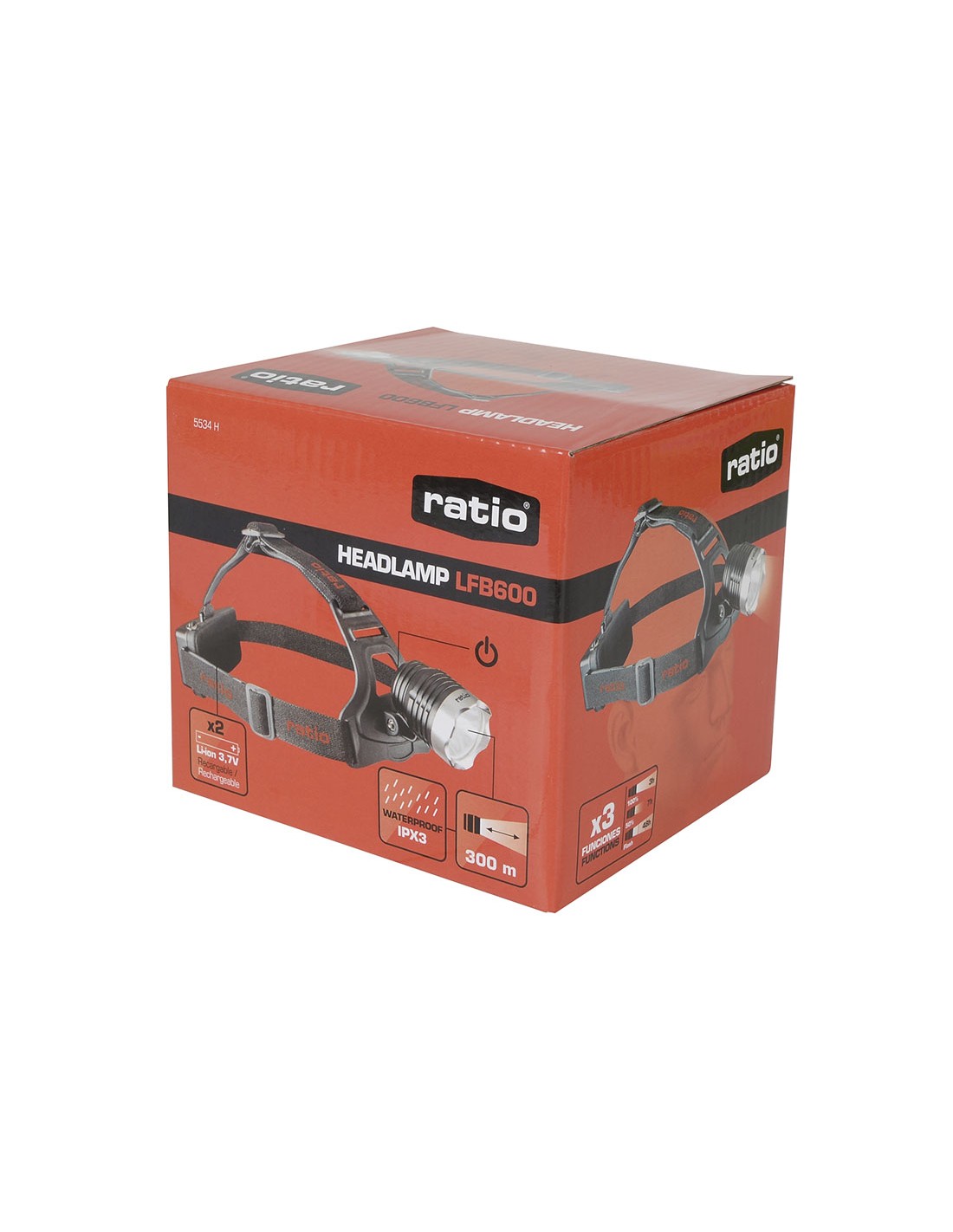 Linterna frontal recargable RATIO HeadLamp LFB600. Led 10 W Cree XML-T6. Cabezal de aluminio y cuerpo ABS. Impermeabilidad: IPX3. 3 Modos de luz: alto, medio y flash. Incluye cargador de pilas + 2 pilas recargables 18650 Li-ión 3,7 V. Potencia máx: 600 lm.