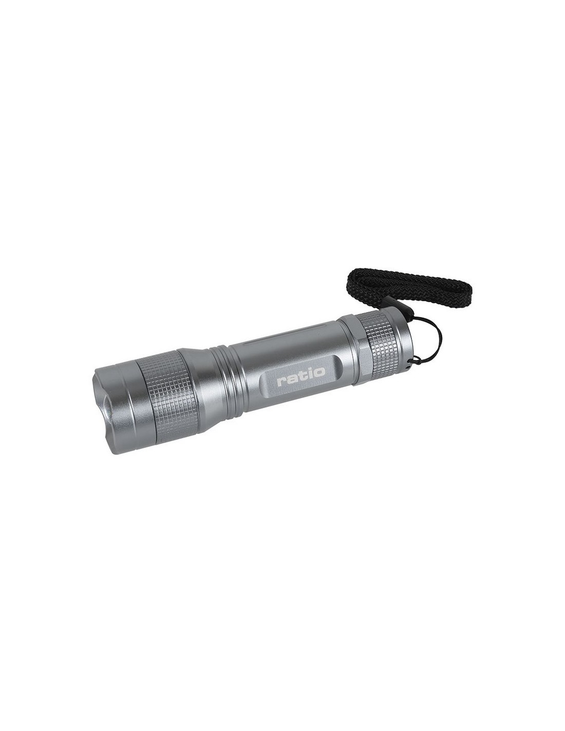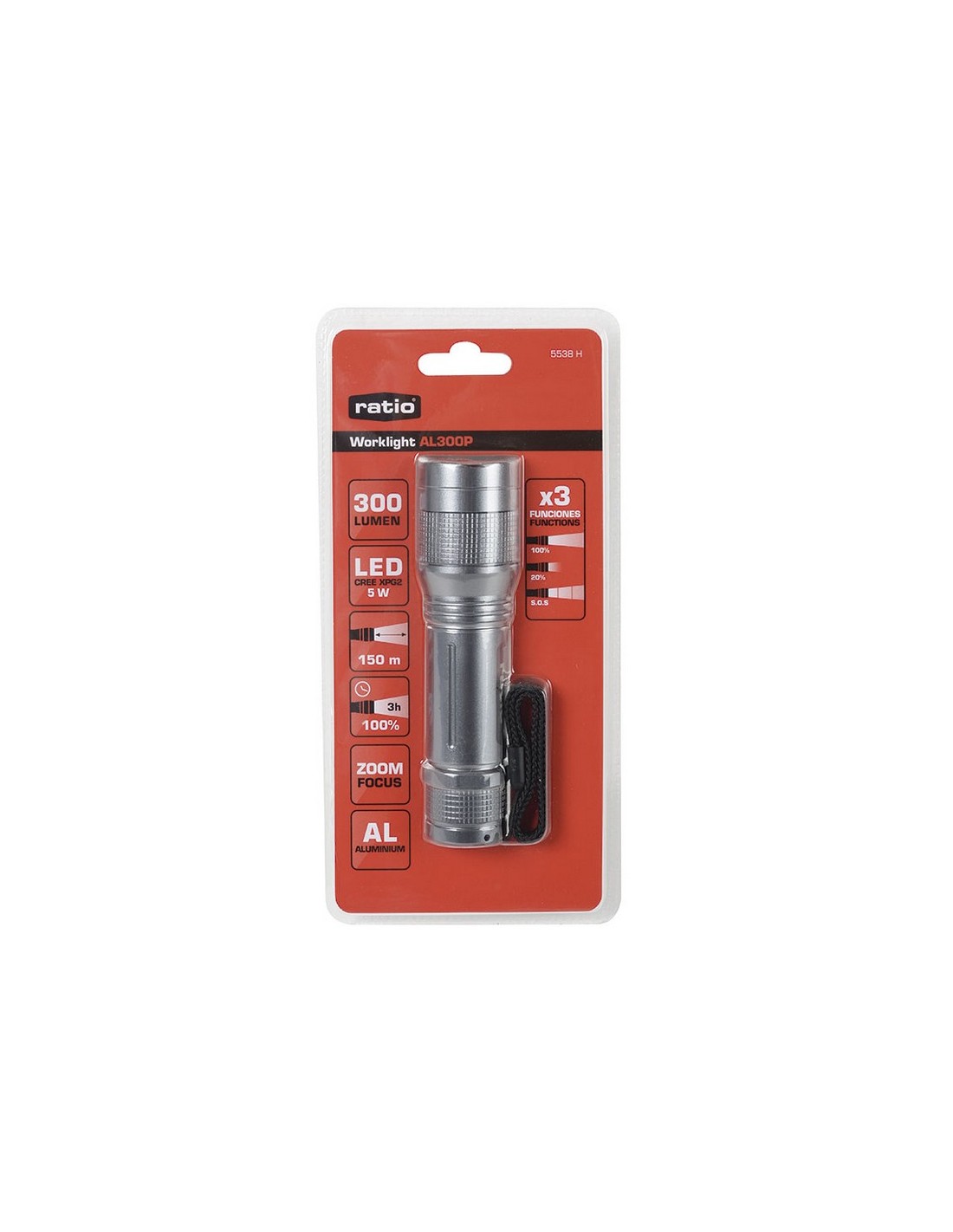 Linterna RATIO Worklight AL300P. Led CREE XPG2 de 5 W. Cuerpo aluminio. 3 funciones: 100%, 20%, SOS. Zoom. Impermeabilidad: IPX4. Correa de mano. Funciona con 3 pilas alcalinas AAA (no incluidas). Potencia máx: 300 lm.