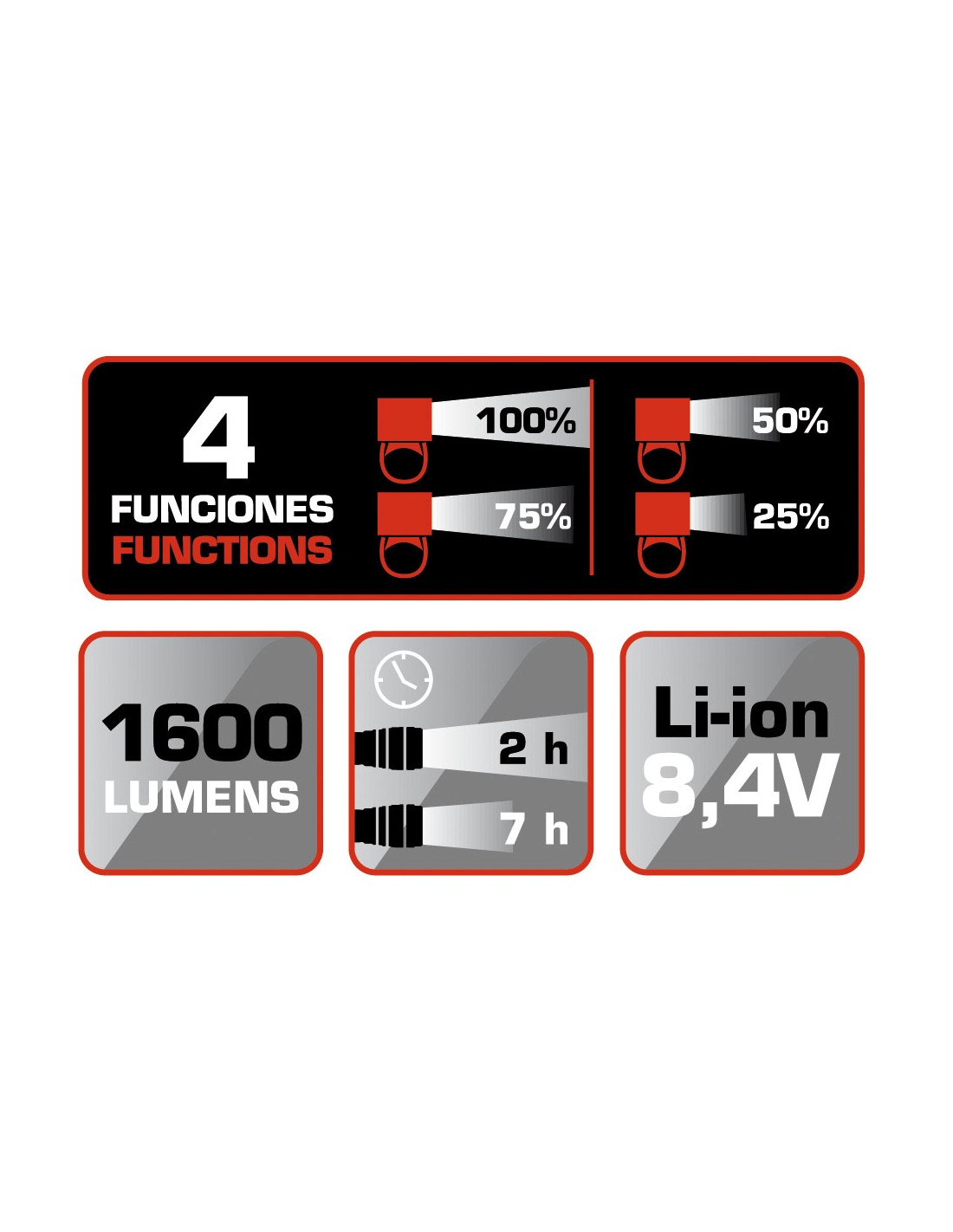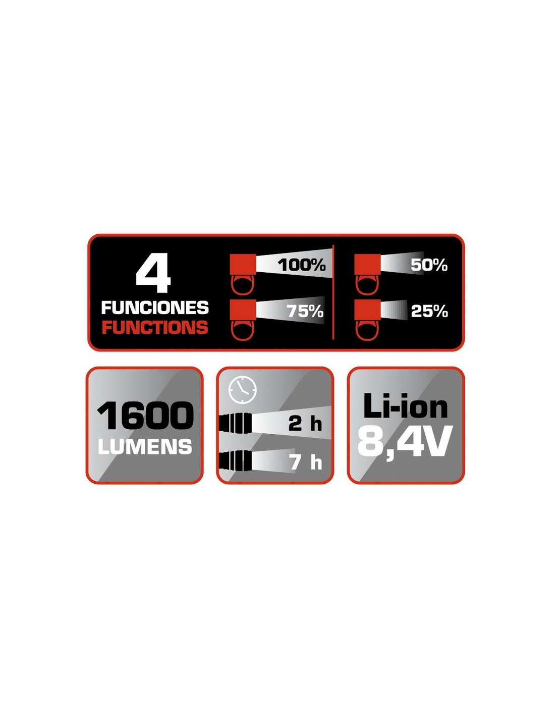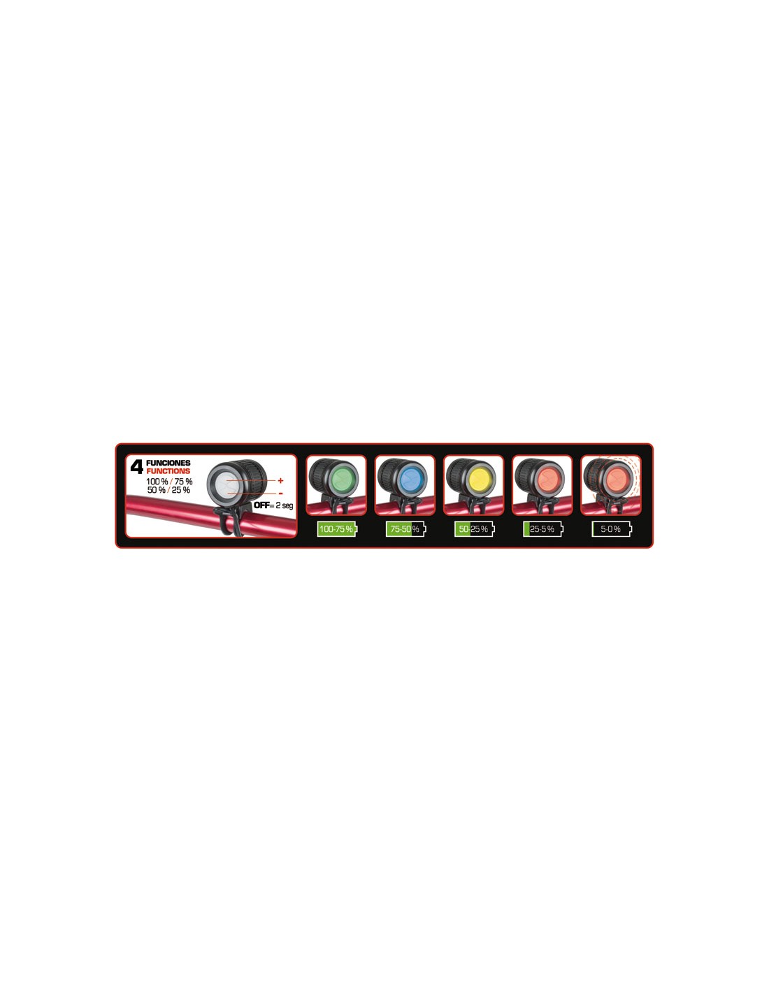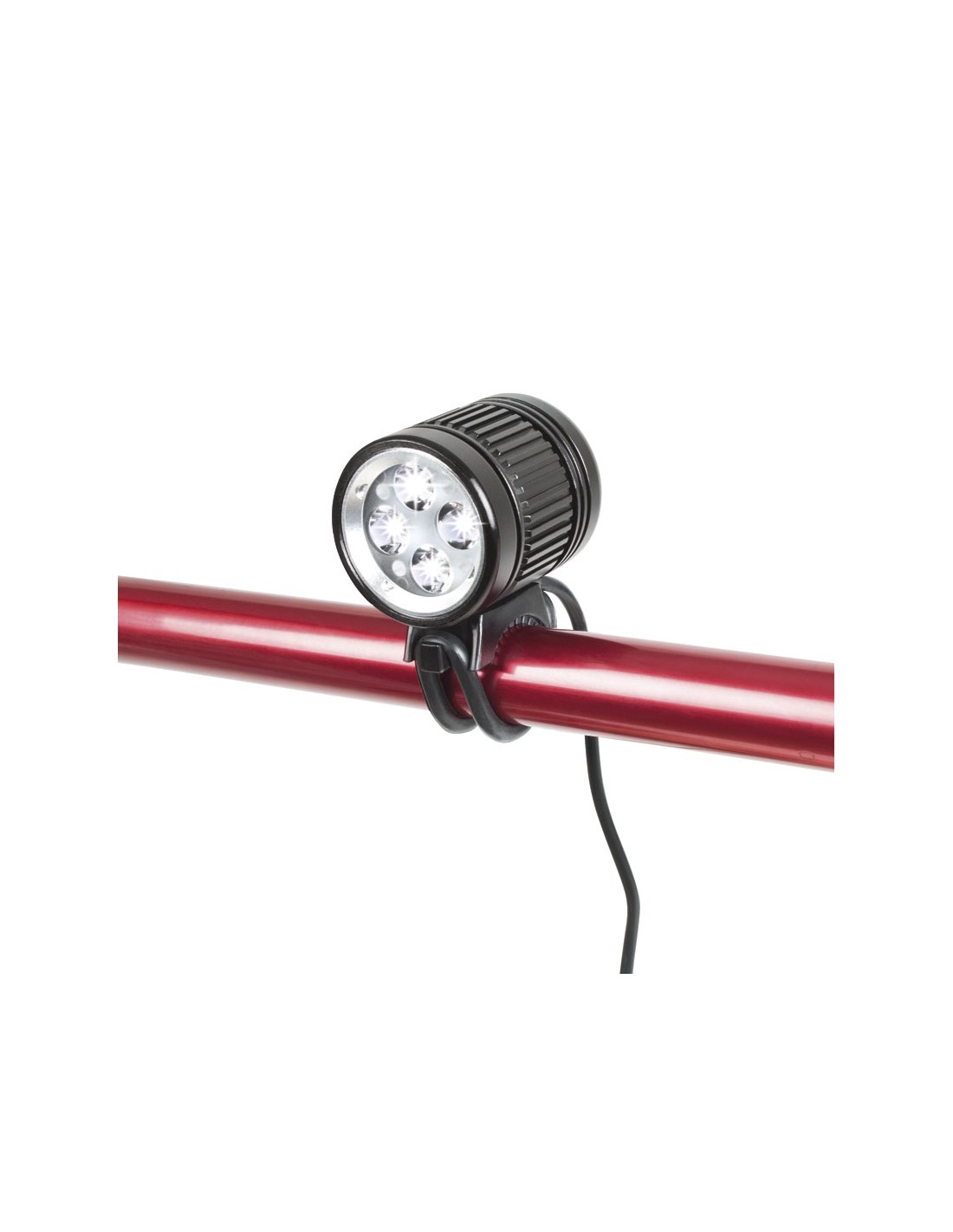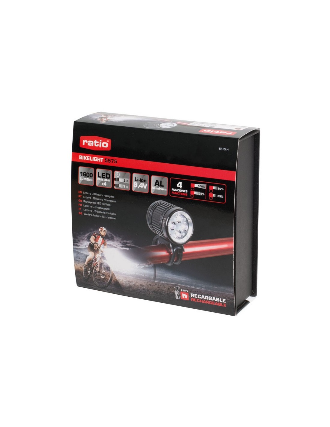 Linterna recargable RATIO BikeLight 5575. Cabezal de aluminio. 4 Led alto rendimiento CREE XP-G. Batería Li-ion 8,4 V/4. 400 mAh. 500 ciclos de carga. Duración 2-7 h según intensidad. 4 funciones: intensidad 100%, 75%, 50% y 25%. Indicador luminoso nivel de carga de batería. Potencia máx: 1600 lm.