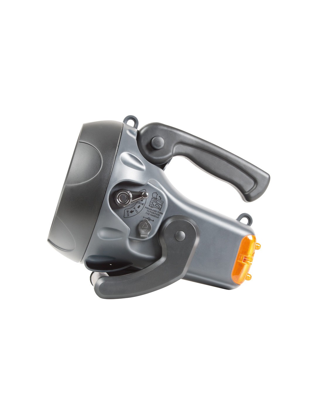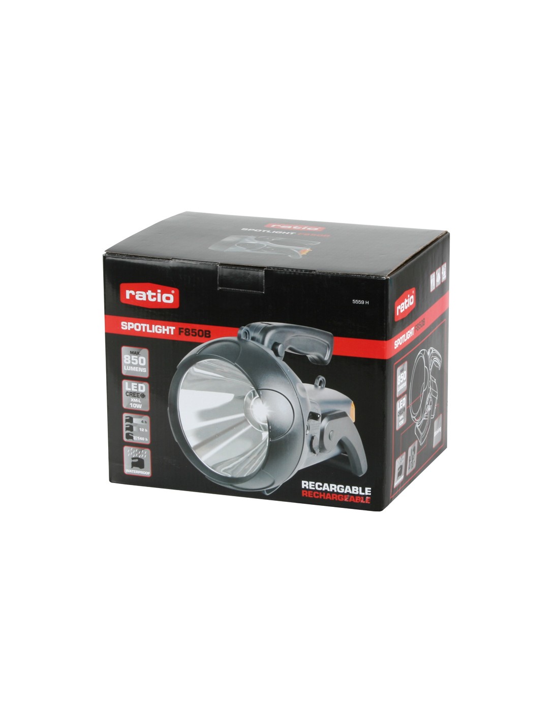 Proyector recargable RATIO Spotlight F850B. Led 10 W alto rendimiento tipo CREE. Carcasa estanca resistente a la intemperie. Base de apoyo ajustable. Mango 2 posiciones. Batería recargable: 220 V / adaptador automóvil 12 V. Potencia máx: 850 lm.