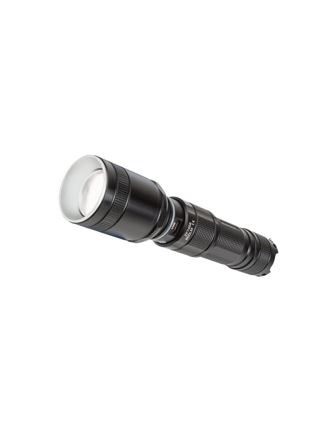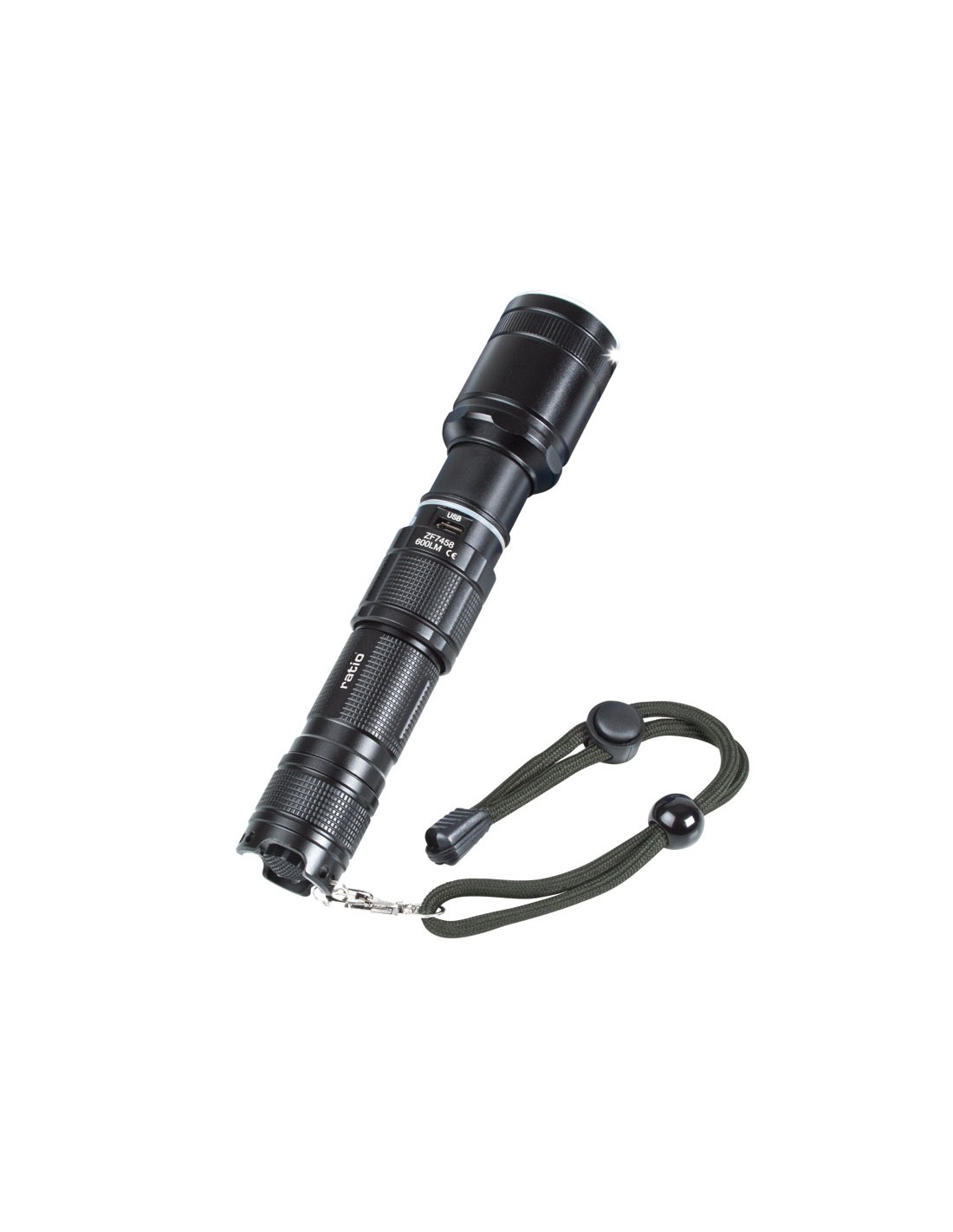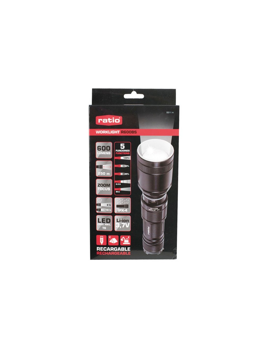 Linterna recargable RATIO R600BS. Cuerpo aluminio antichoc. Led alto rendimiento CREE XM-LT6. 5 funciones: Intensidad 100%, 50%, 25%, SOS, y parpadeo estroboscópico. Batería Li-ion 3,7 V. Duración: 2-16 horas según intensidad. Cargador USB. Incluye cable Micro USB. Foco zoom regulable. Impermeabilidad IPX-4. Potencia máx: 600 lm.