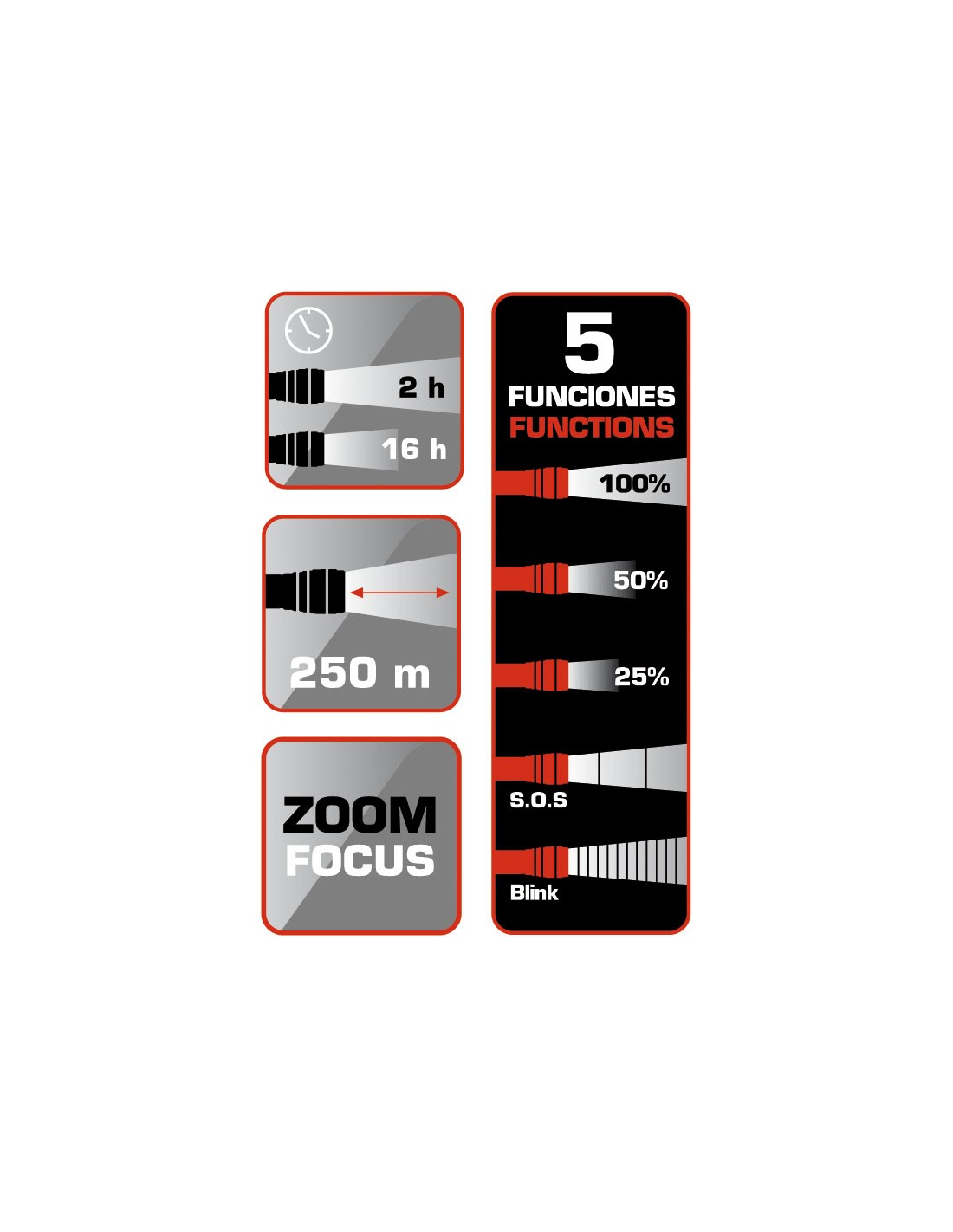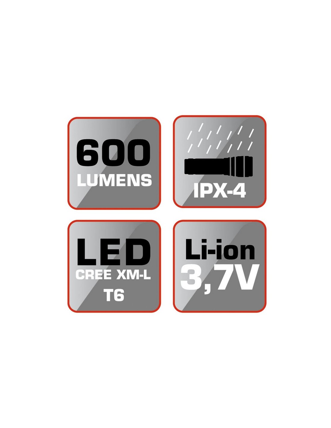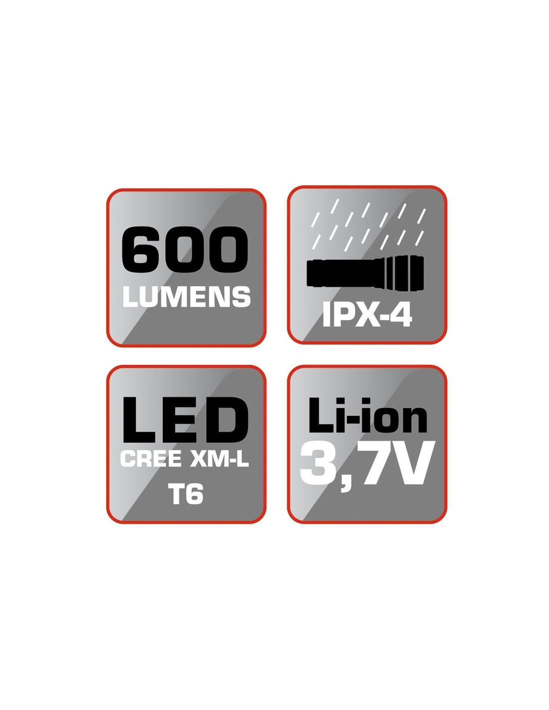 Linterna recargable RATIO R600BS. Cuerpo aluminio antichoc. Led alto rendimiento CREE XM-LT6. 5 funciones: Intensidad 100%, 50%, 25%, SOS, y parpadeo estroboscópico. Batería Li-ion 3,7 V. Duración: 2-16 horas según intensidad. Cargador USB. Incluye cable Micro USB. Foco zoom regulable. Impermeabilidad IPX-4. Potencia máx: 600 lm.