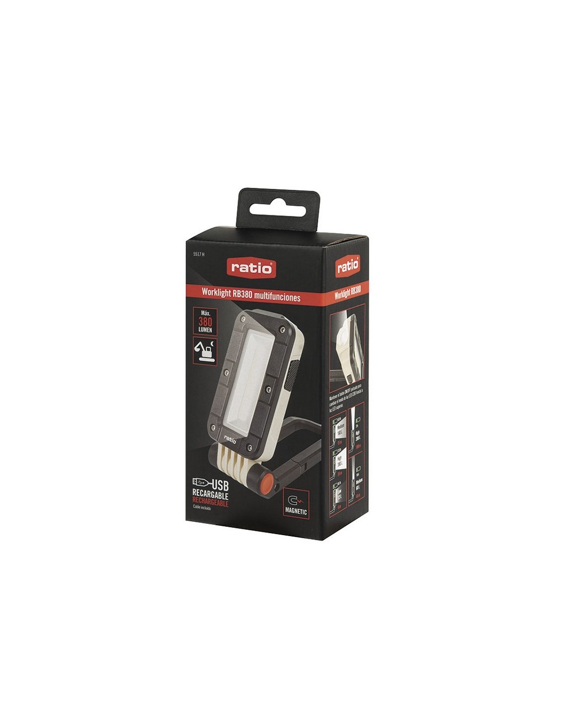 Linterna recargable RATIO Worklight RB380 Luz COB frontal y luz Led superior LPGC2 S3. Batería recargable 2.000 mAh. Con gancho soporte giratorio 180º y 3 imanes. Impermeabilidad: IPX-5. Incluye cable micro USB. Potencia máx. 380 lm.