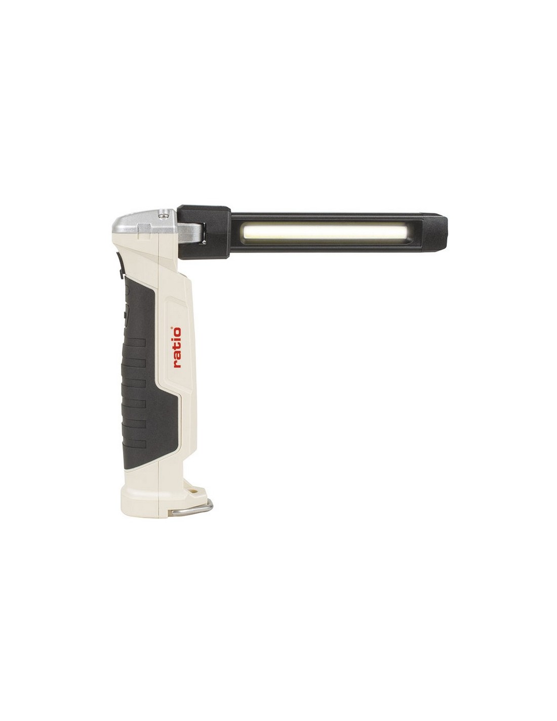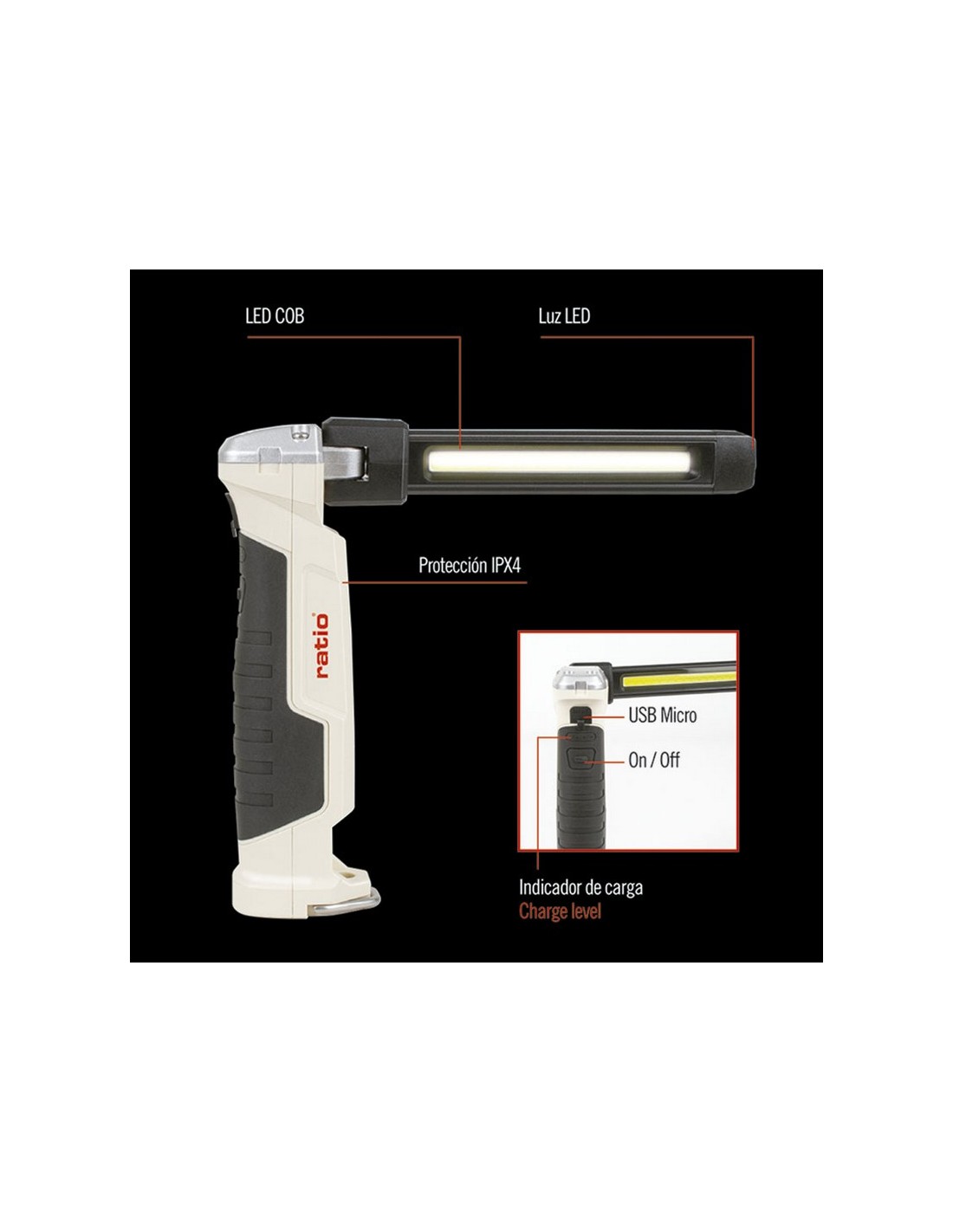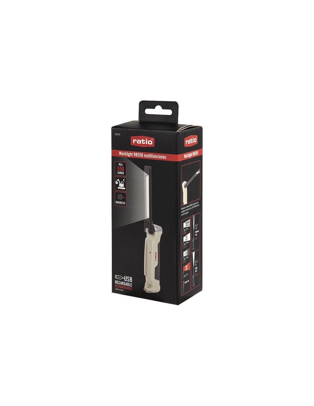 Linterna recargable RATIO Worklight RB550 Luz COB frontal y luz Led superior. GMKJ3030. 9 funciones. Incluye 1 cable micro USB. Batería recargable 2.000 mAh. Con imán muy fuerte en extremo y gancho desplegable para colgar. La luz COB puede moverse y rotar 180º. Impermeabilidad: IPX-4. Incluye luz roja. Potencia máx. 550 lm.