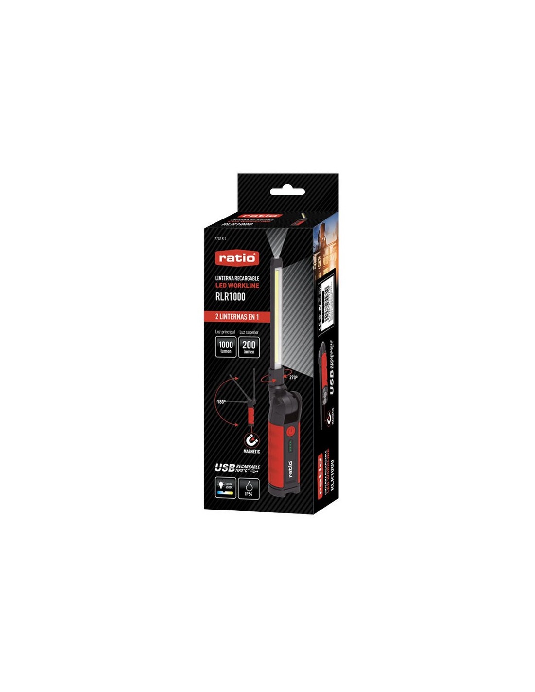 Linterna recargable Led RATIO Workline RLR1000 Luz COB frontal y luz Led superior. Incluye 1 cable micro USB. Batería recargable 2.500 mAh. La luz COB puede moverse y rotar 180º. Cabezal plegable. Base magnética. Luz COB frontal. Potencia máx. 1000 lm.
