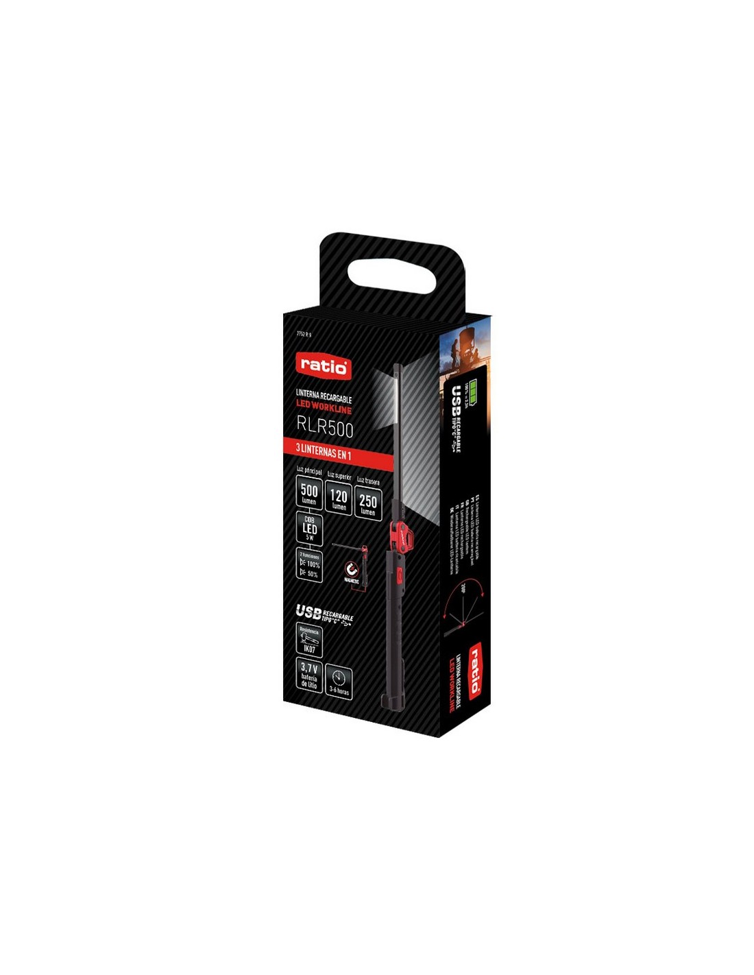 Linterna recargable Led RATIO Workline RB1000 Led COB. Recargable USB. Tiempo de carga 2,5 horas aprox. Resistente al agua 2 m. Cabezal plegable. 1 m de cable USB tipo C. Base magnética. Luz COB frontal. Potencia máx. 500 lm.