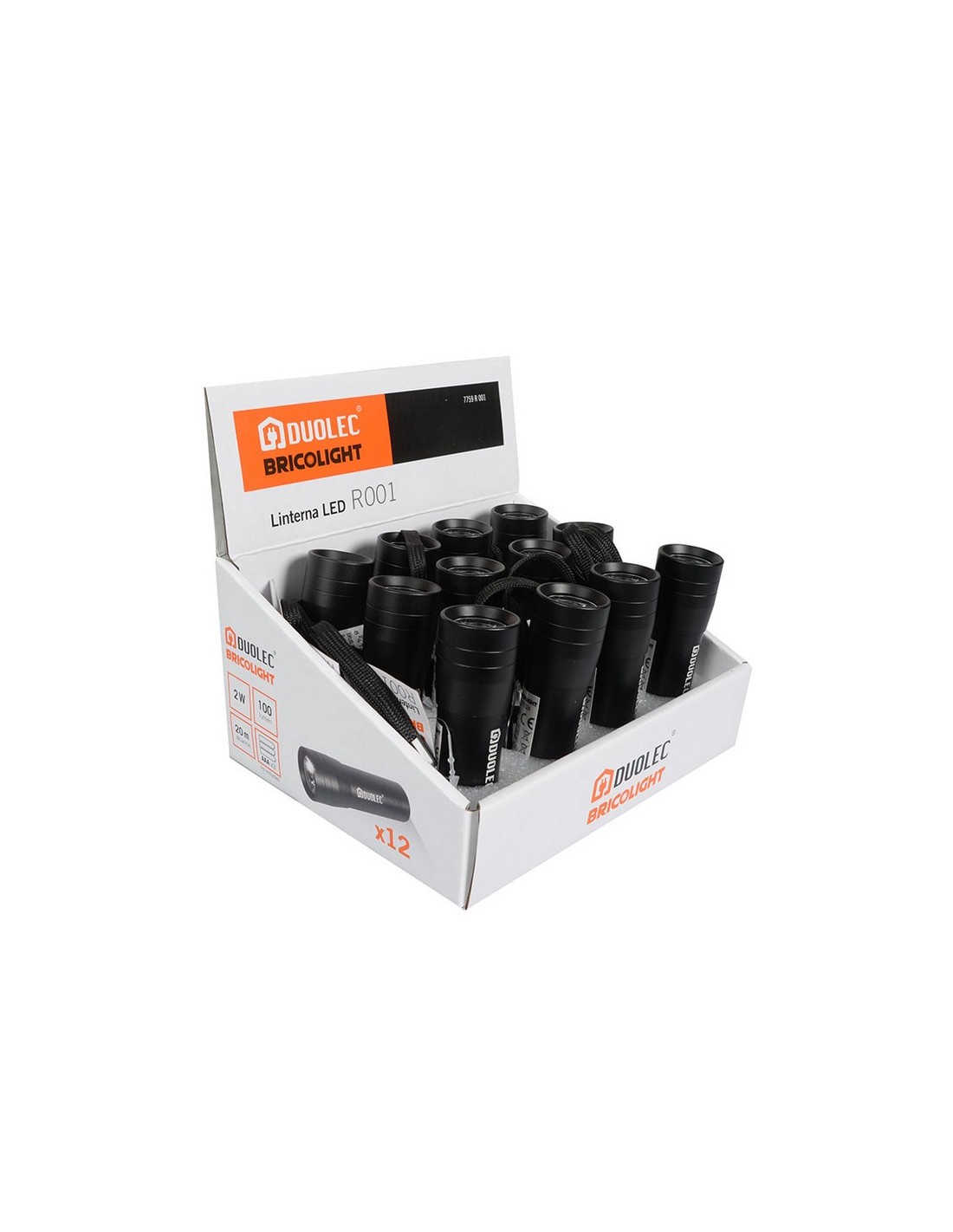 Linterna Led DUOLEC Bricolight R001 Cuerpo aluminio. Correa transporte. 3 pilas AAA (no incluidas). LED no reemplazable. Expositor display 12 unidades. Potencia máx: 2 W / 100 lm.