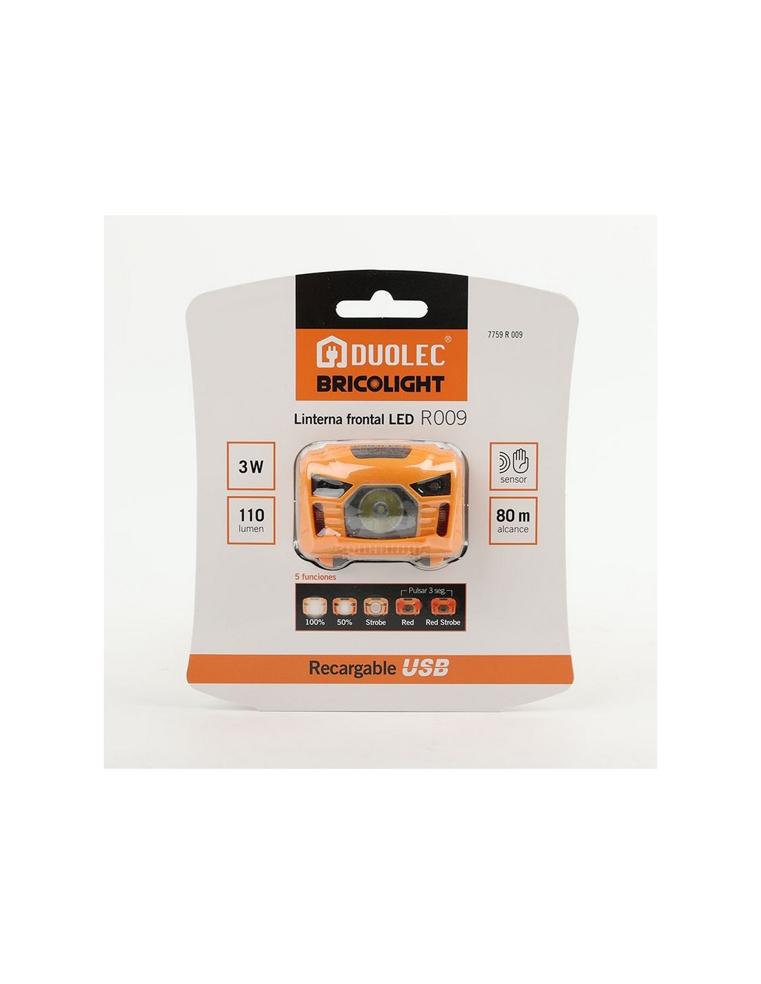 Linterna Led frontal DUOLEC Bricolight R009 Batería litio recargable. 3,7 V 1.200 mAh. Con sensor ON/OFF. Función de señalización. Led no reemplazable. IP44. Expositor display 6 unidades. Potencia máx: 3 W. / 110 lm.
