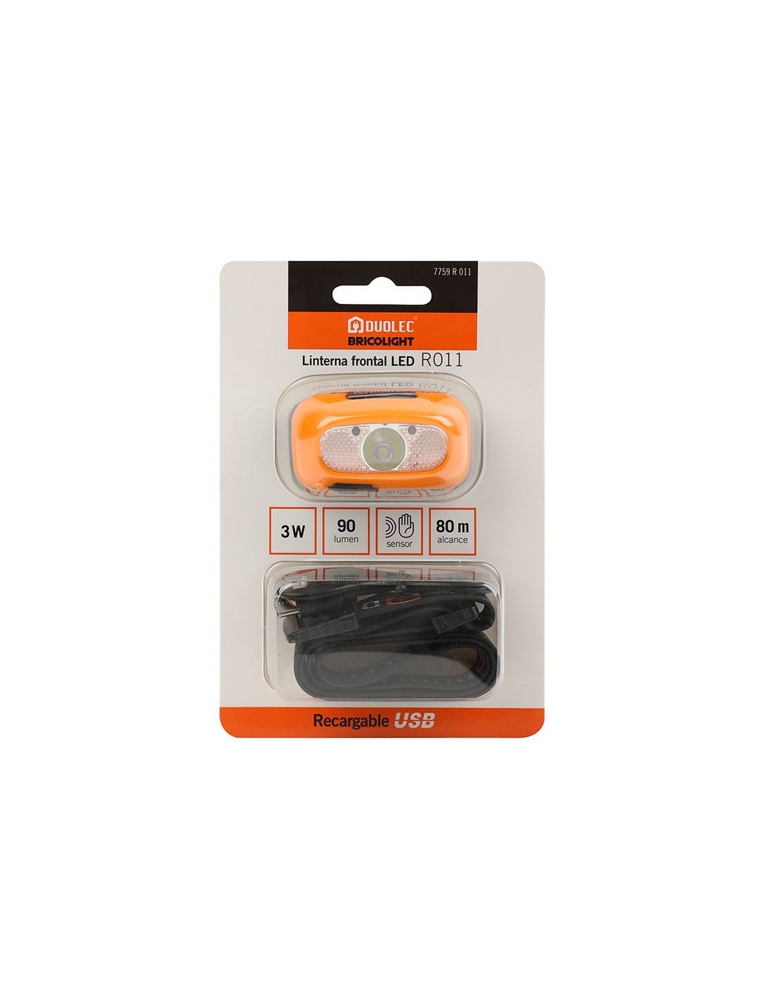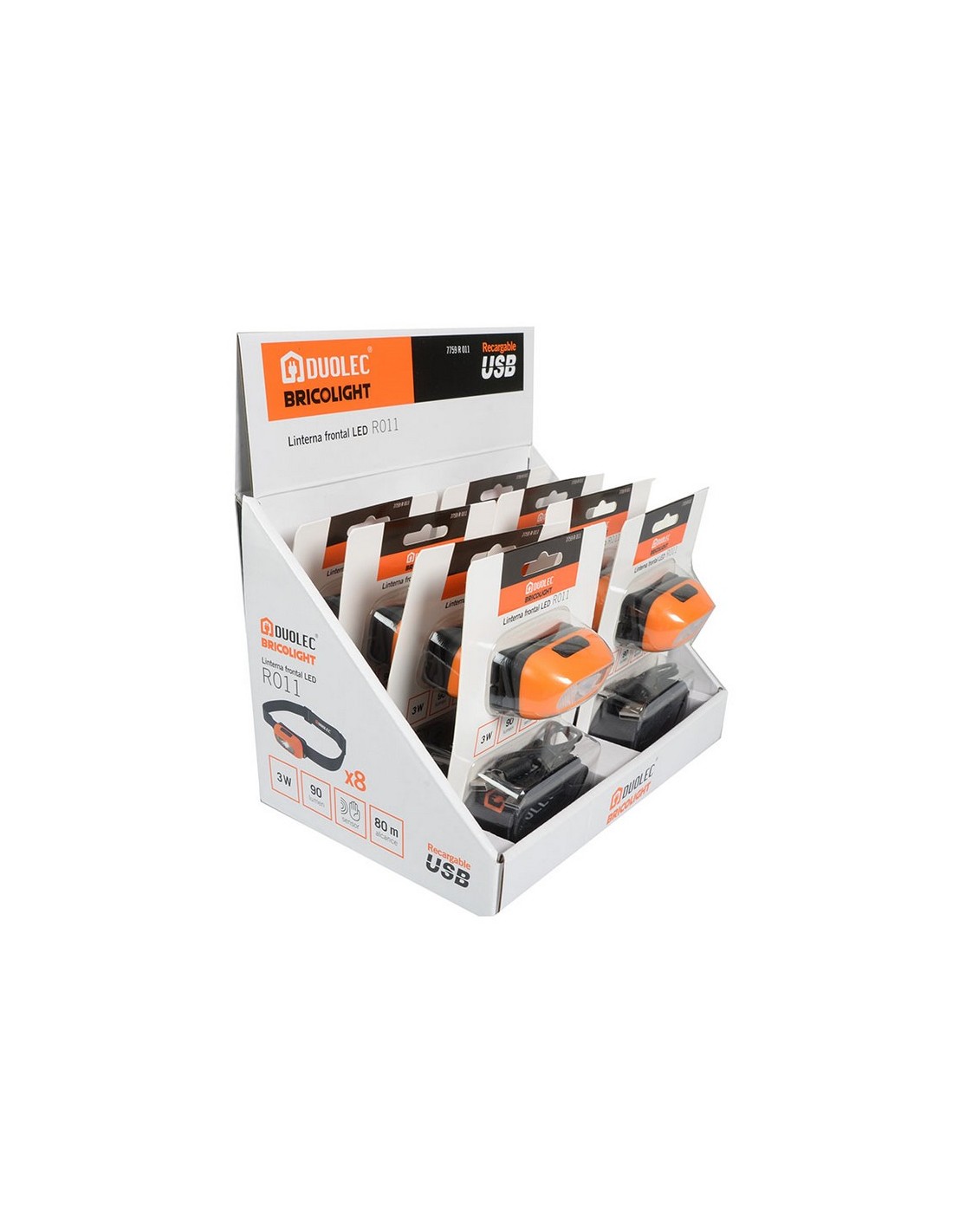 Linterna Led frontal DUOLEC Bricolight R011 Batería litio 3,7 V 800 mAh. Recargable USB. Función de señalización. LED no reemplazable. Expositor display 8 unidades. Potencia máx: 3 W. / 90 lm.