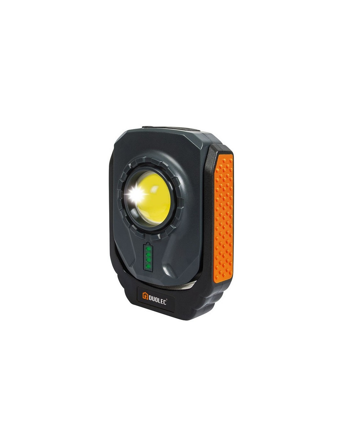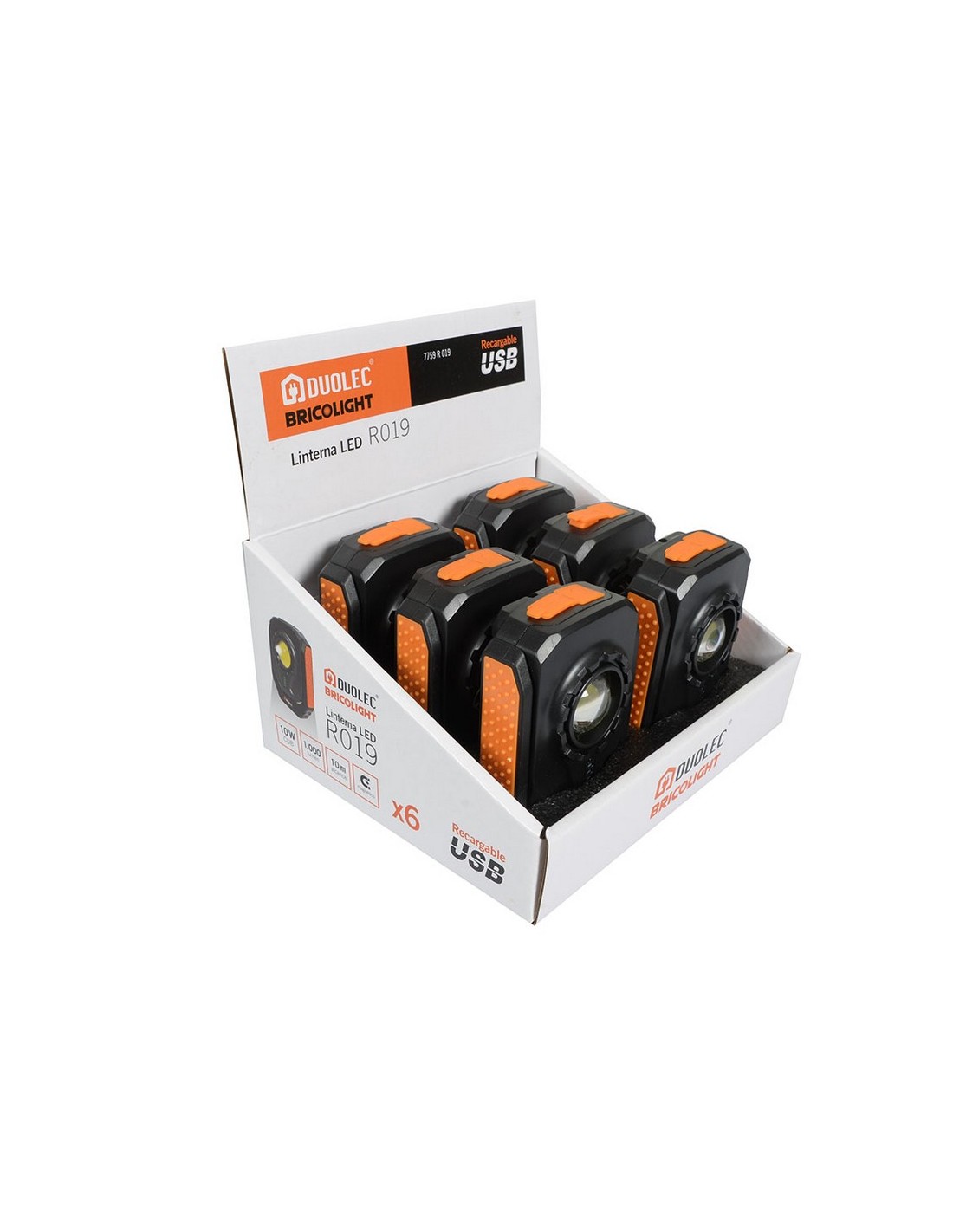 Linterna Led DUOLEC Bricolight R019 Cuerpo de plástico. Iluminación frontal. Batería litio recargable 3,7 V 2.000 mAh. Orientable con imán y gancho. Recargable USB. Función de batería portátil. LED no reemplazable. Expositor display 6 unidades. Potencia máx: 10 W COB. / 1.000 lm.
