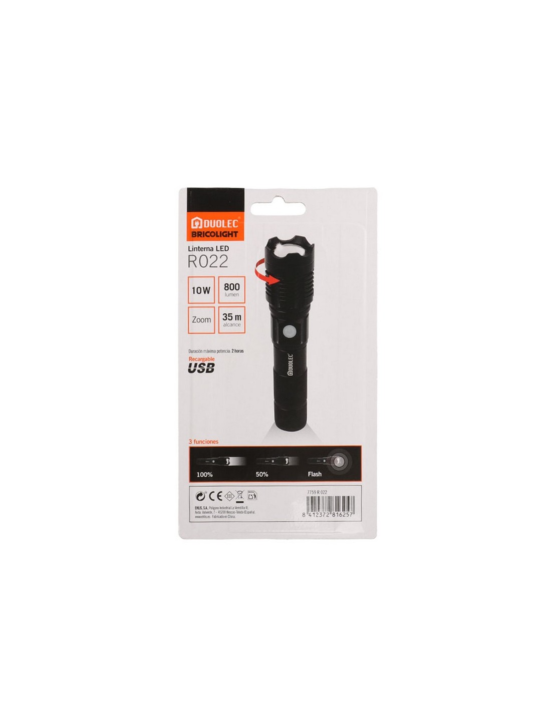 Linterna Led DUOLEC Bricolight R022 Luz LED fría. Cuerpo de aluminio. Función zoom. Recargable USB C. 3 Modos de funcionamiento: 100% - 50% - Flash. Potencia máx:10W / 800 lm.