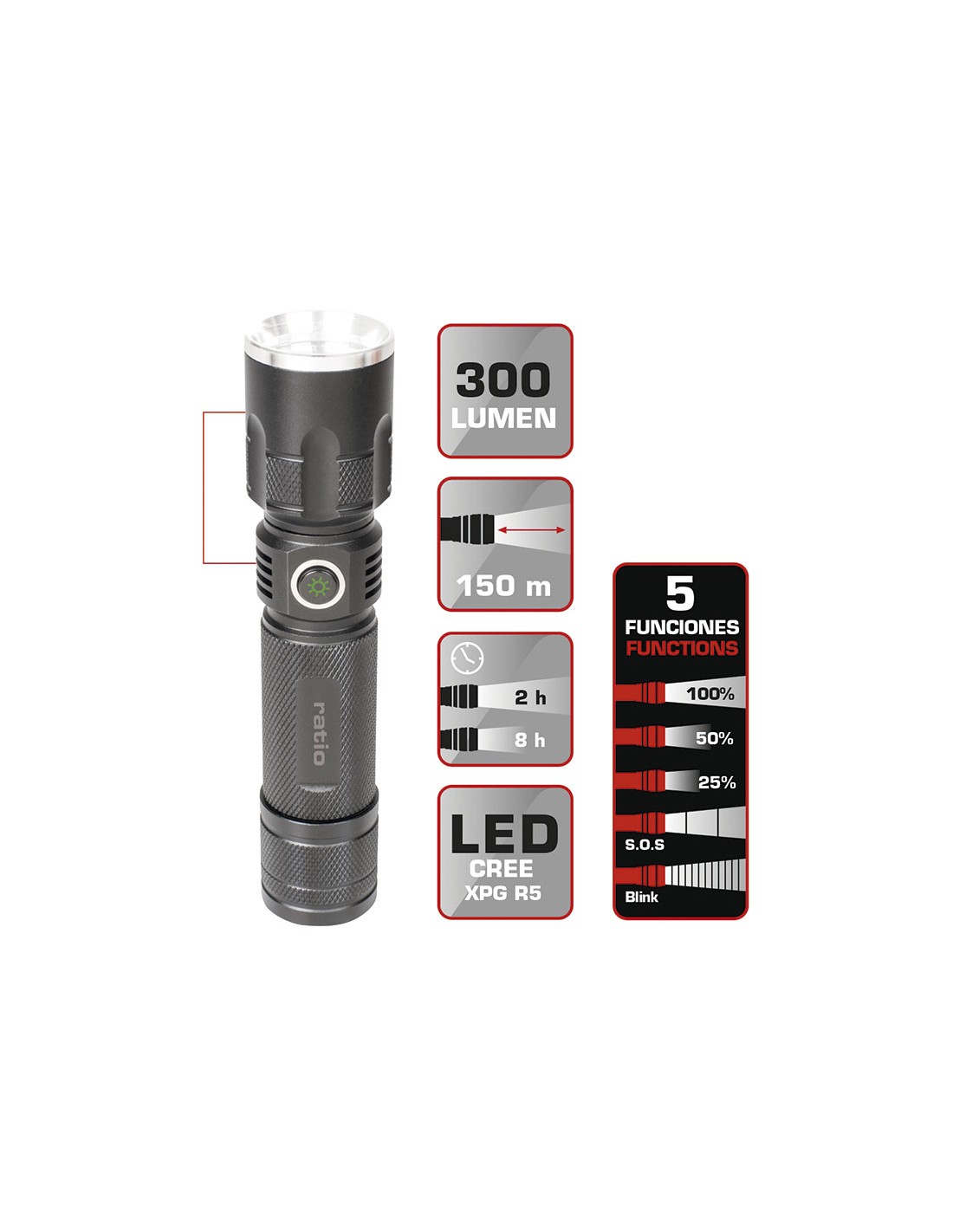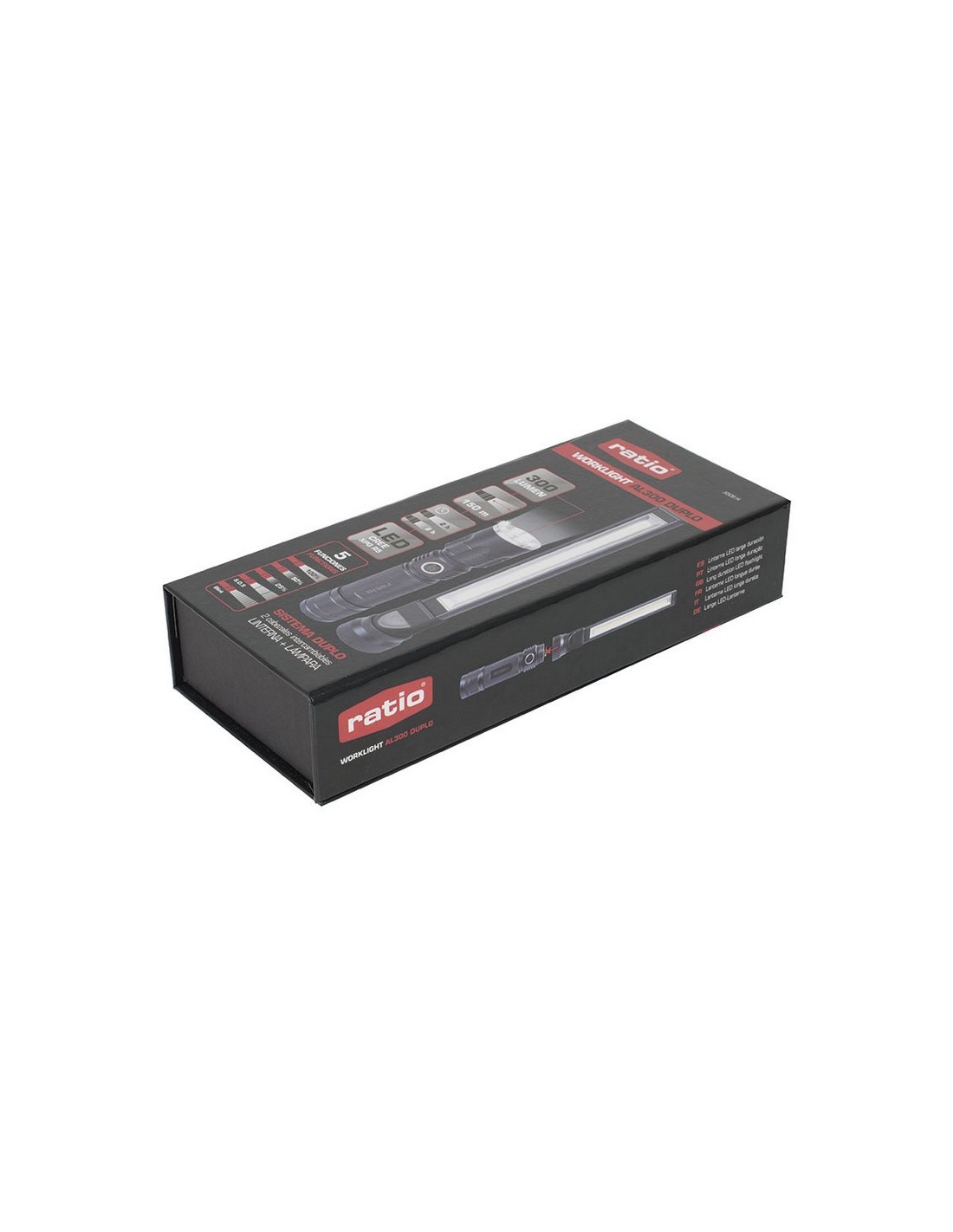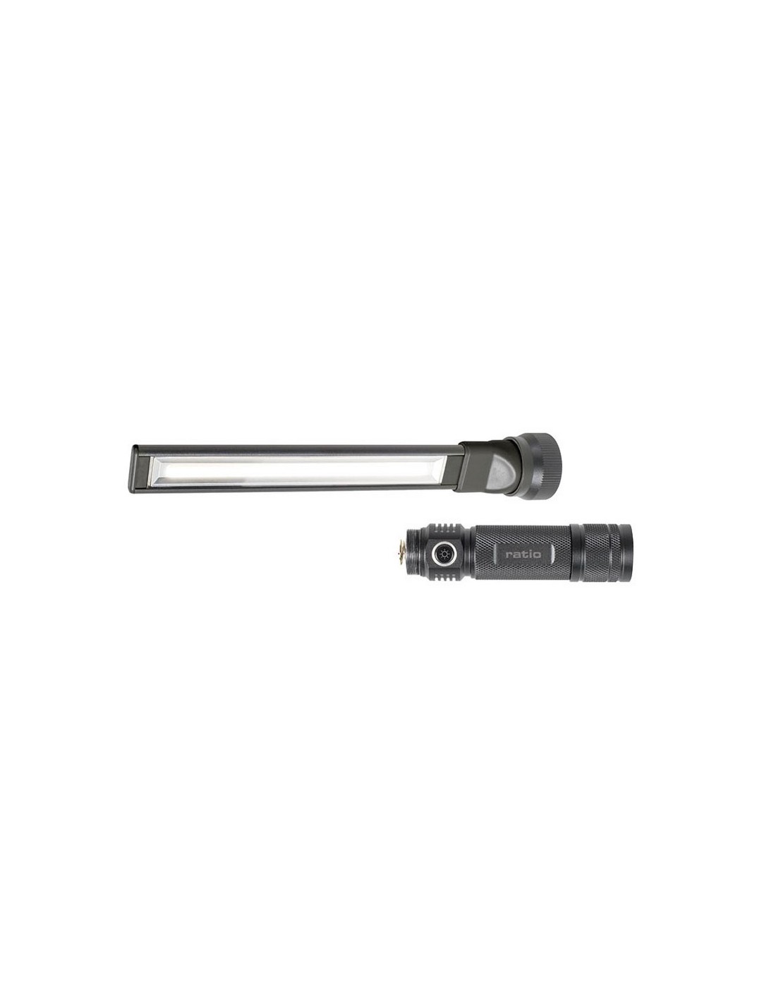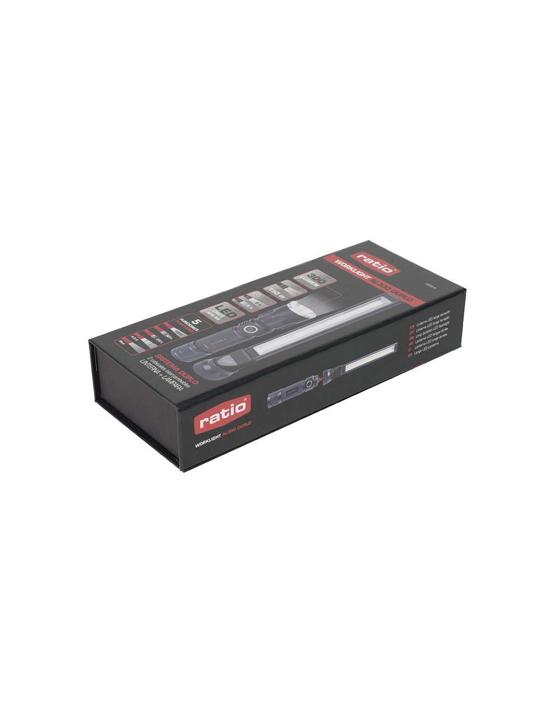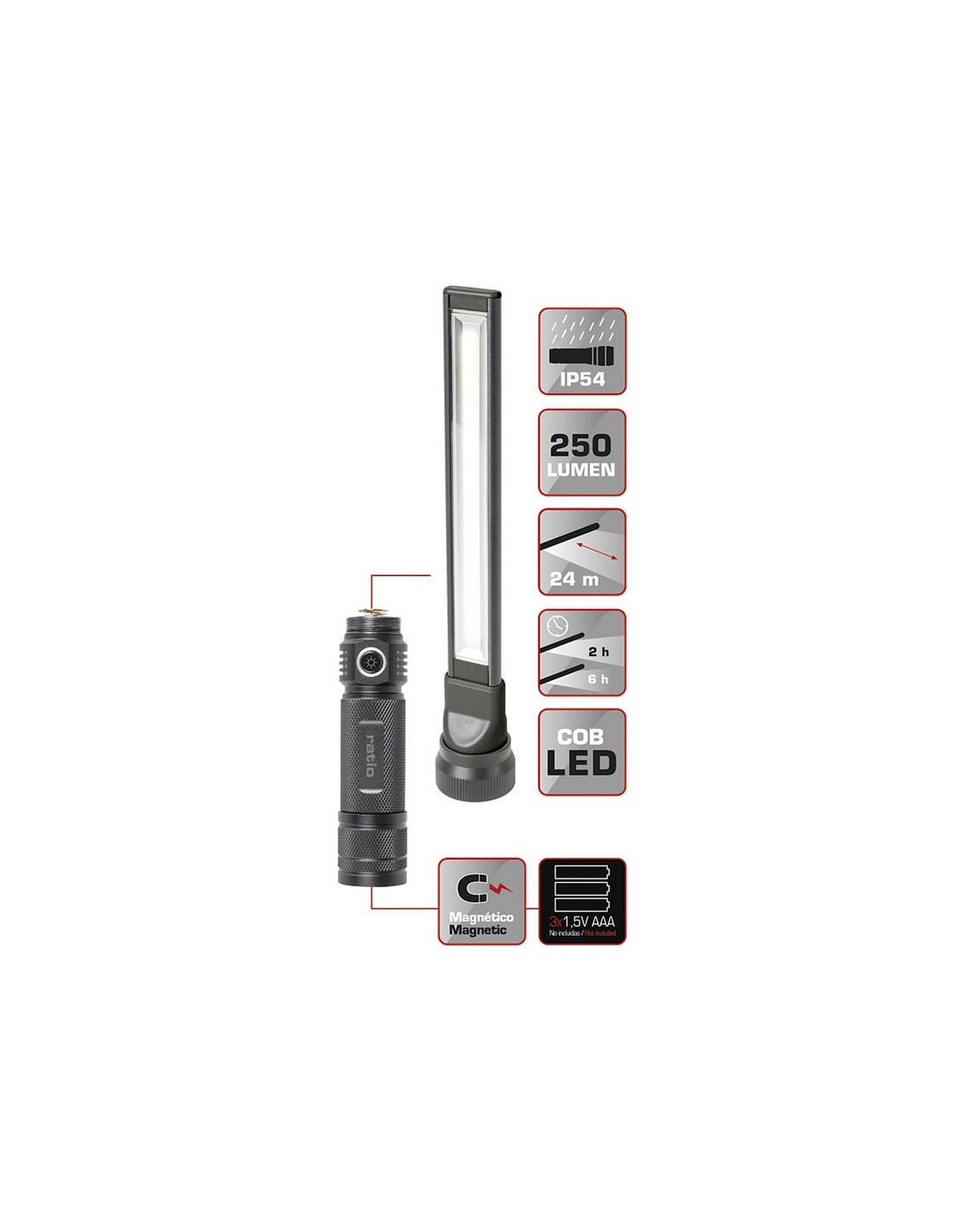 Linterna RATIO 2en1 WorkLight AL300 Duplo. 2 cabezales intercambiables. Linterna Led CREE XPG R5 y lámpara Led COB de alta eficacia. 5 funciones: 100% - 50% - 25% - estroboscópica - SOS. Cuerpo de aluminio anodizado con extremo magnético. Impermeabilidad IP54. Indicador de batería baja. Funciona con 3 pilas alcalinas AAA (no incluidas). Potencia máxima: