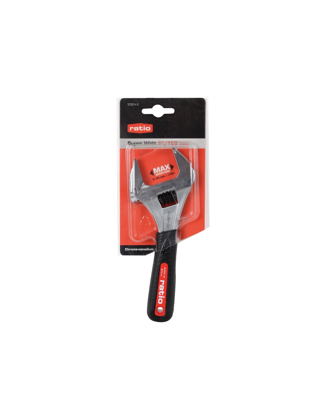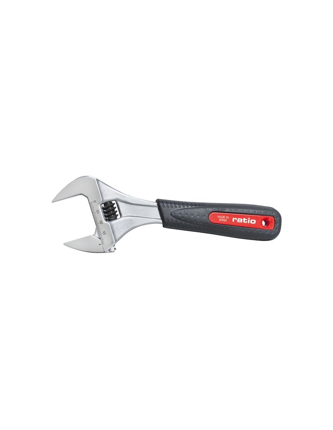 Llave graduable boca ancha RATIO Super Wide. Gran apertura de bocas +78% ó +62% según modelo. Acero cromo-vanadio. Empuñadura ergonómica. Mango completo bajo la empuñadura. Escala milimétrica. Fabricación nacional. 6\"-150 mm. +78%. Peso 205 gr.