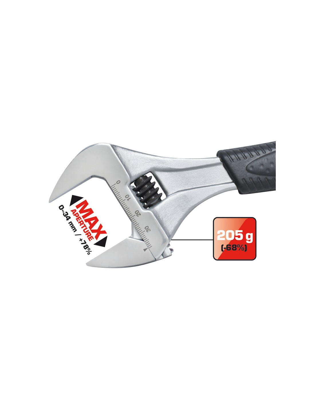 Llave graduable boca ancha RATIO Super Wide. Gran apertura de bocas +78% ó +62% según modelo. Acero cromo-vanadio. Empuñadura ergonómica. Mango completo bajo la empuñadura. Escala milimétrica. Fabricación nacional. 8\"-200 mm. +62%. Peso 345 gr.
