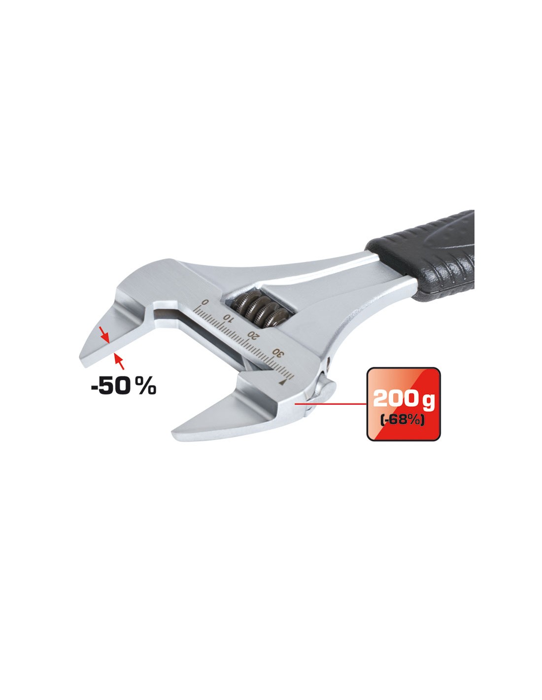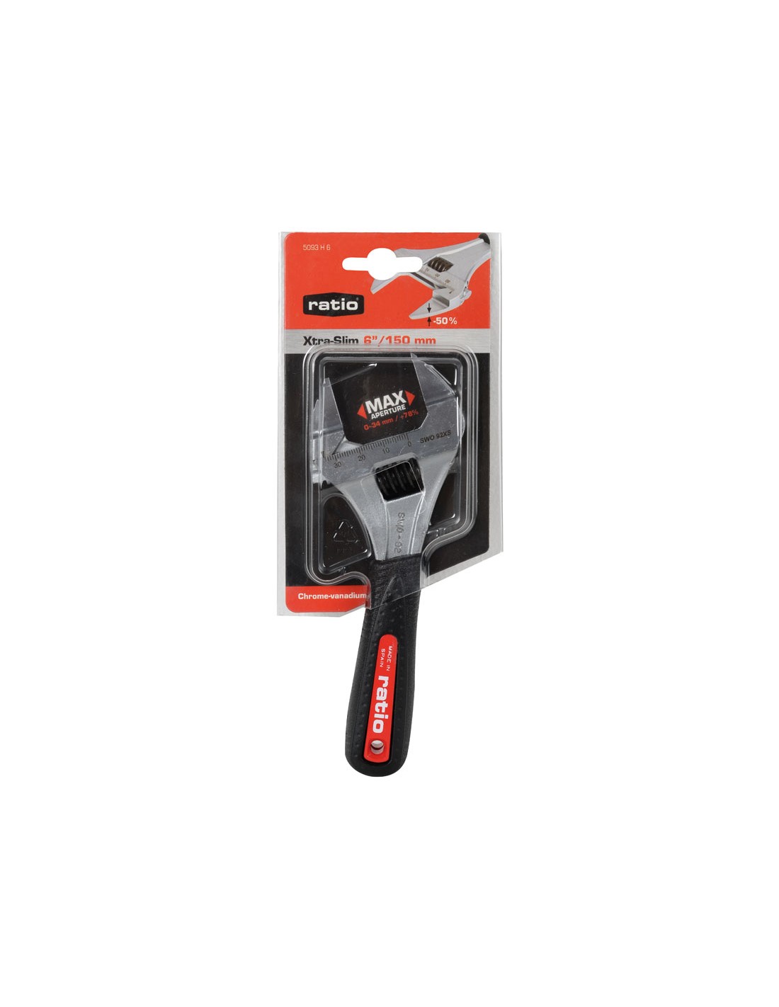 Llave graduable boca extrafina RATIO Xtra-Slim. Bocas extrafinas, 50% más delgada que una llave estándar. Abertura de bocas +78% ó +62% según modelo. Acero cromo-vanadio. Empuñadura ergonómica. Mango completo bajo la empuñadura. Escala milimétrica. Fabricación nacional. 6\"-150 mm. Peso 200 gr.