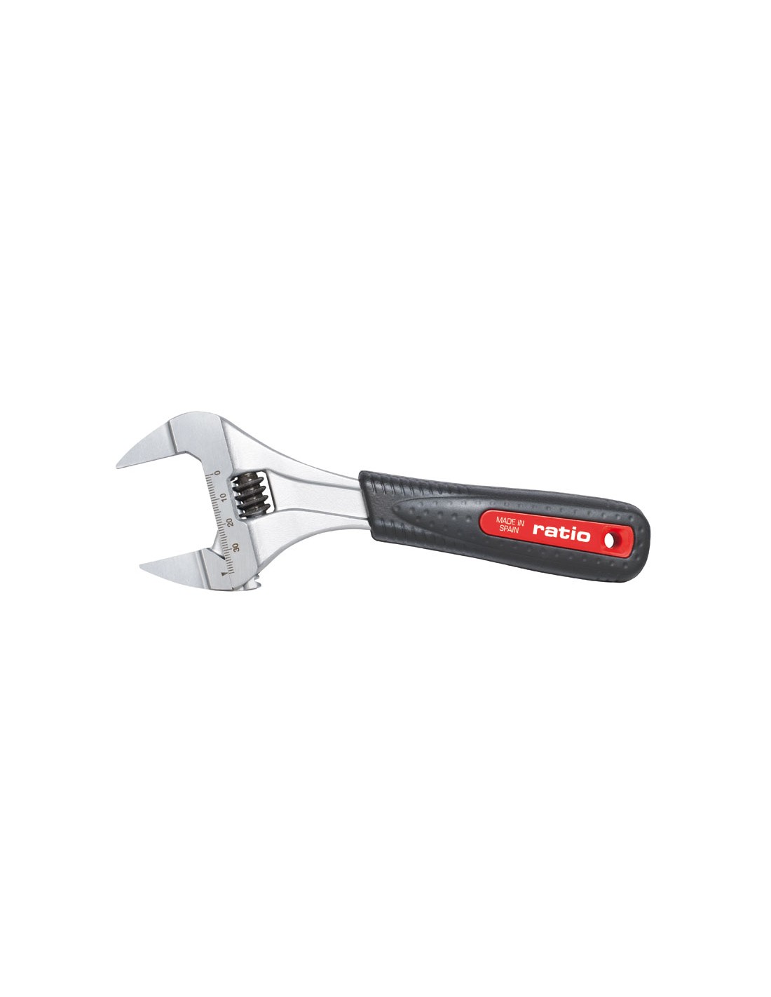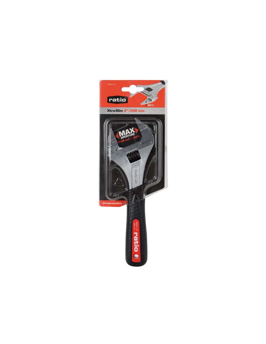 Llave graduable boca extrafina RATIO Xtra-Slim. Bocas extrafinas, 50% más delgada que una llave estándar. Abertura de bocas +78% ó +62% según modelo. Acero cromo-vanadio. Empuñadura ergonómica. Mango completo bajo la empuñadura. Escala milimétrica. Fabricación nacional. 8\"-200 mm. Peso 335 gr.