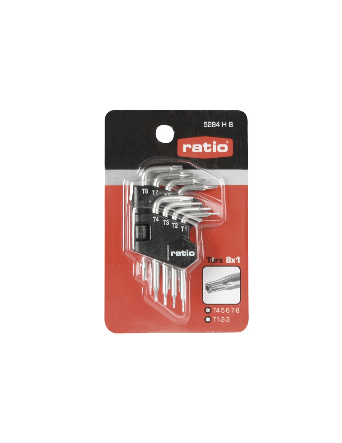Llave acodada Torx RATIO micro 5284 8 piezas. Acero S2 satinado. Soporte plástico articulado. Especiales para electrónica. Composición: Torx: T1-T2-T3.