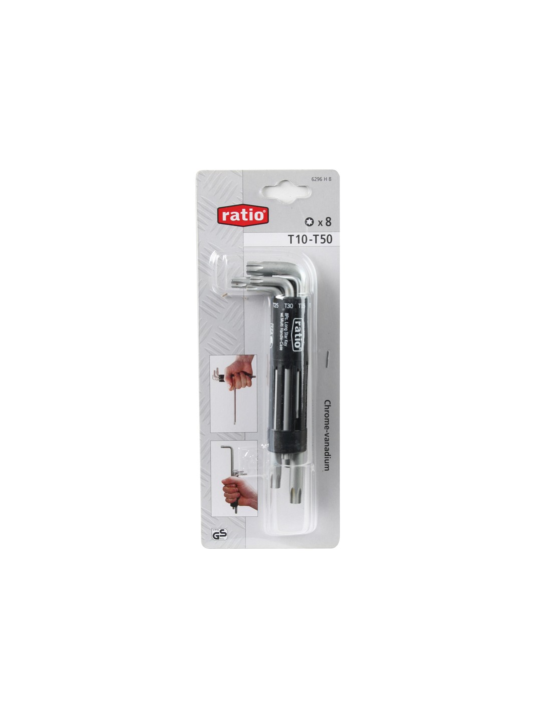 Llave acodada Torx RATIO 6296 8 piezas. Cromo-vanadio. Soporte plástico especial. T10-15-20-25-30-40-45-50.