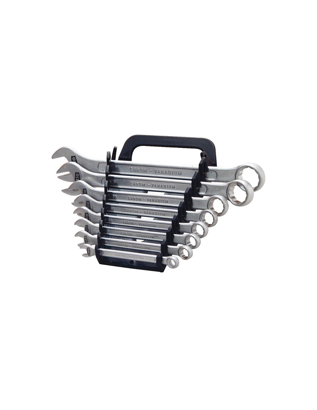 Llaves fija combinada RATIO serie 6000. Acero cromo-vanadio satinado. Cuello de llave más ancho, aumenta la tensión de apriete. Cabeza con anillo estrecho y perfil alto, sujección máxima de latuerca. Juego 8 pzas. 6, 8-11, 13, 17, 19 mm.