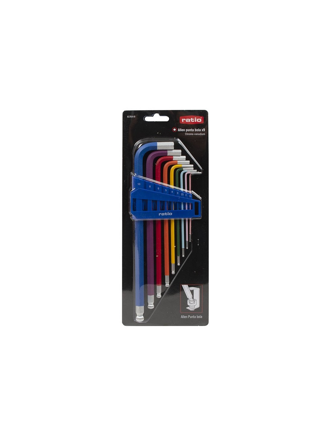Llave acodada Allen RATIO 6178 Punta bola, 9 piezas, formato extra largo. Acero cromo-vanadio con recubrimiento de pintura electrostática de color para facilitar la diferenciación de medidas. Soporte plástico.. 1,5-2-2,5-3-4-5-6-8-10 mm.