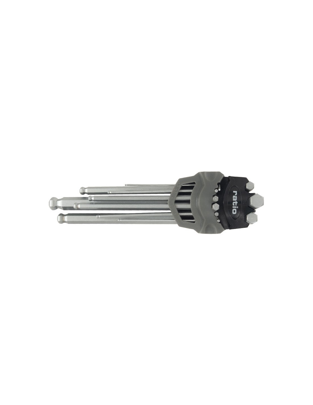 Llave acodada Allen RATIO 6192 Punta bola. 9 piezas acero alta calidad S2 acabado satinado. Soporte plástico con clip para cinturón. 1,5-2-2,5-3-4-5-6-8-10 mm.