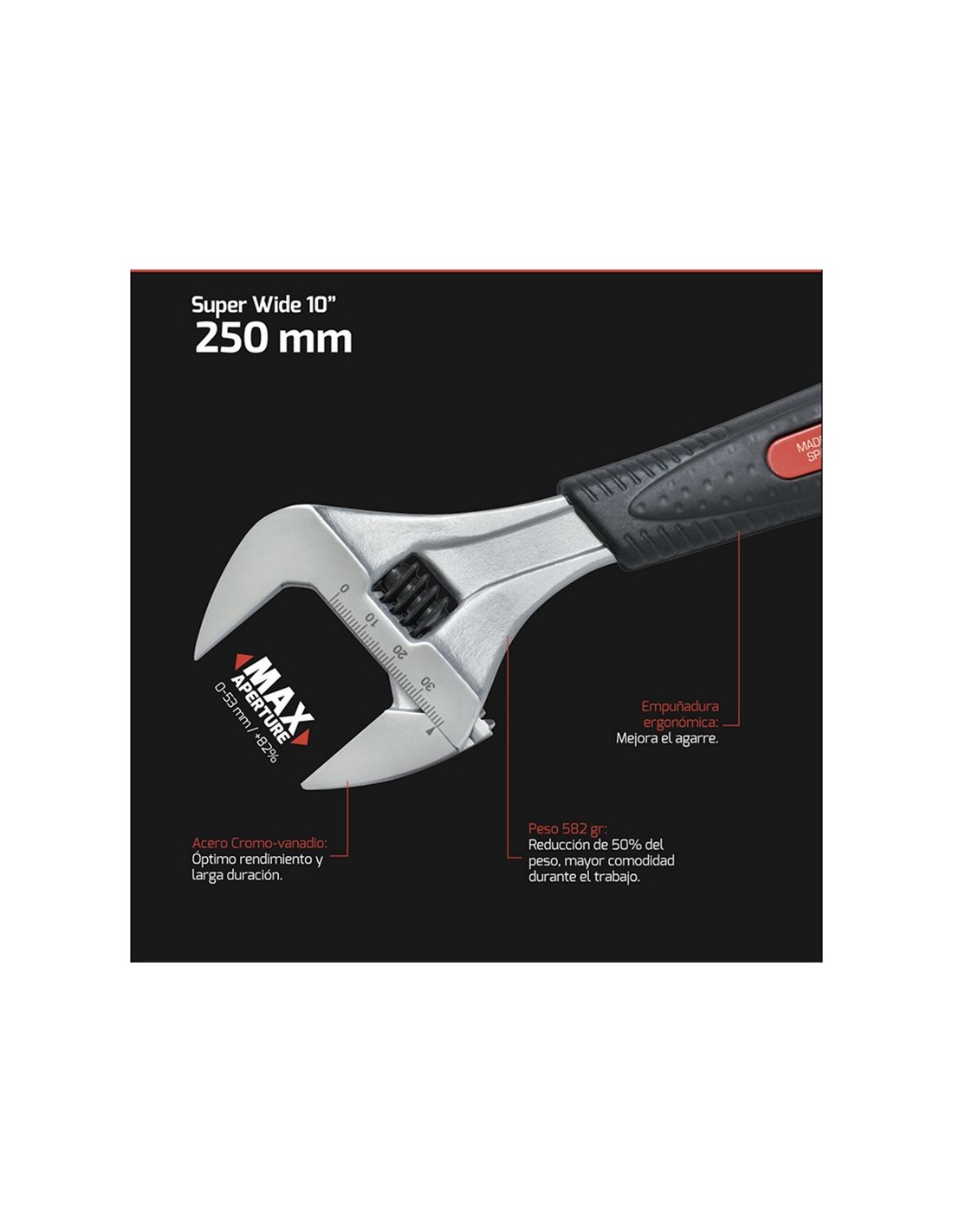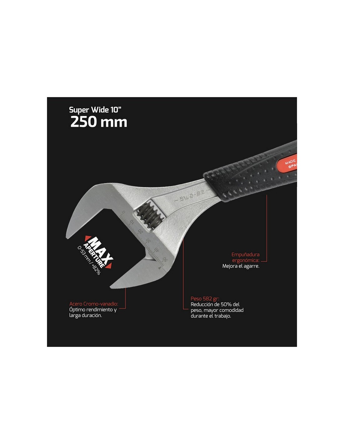 Llave graduable boca ancha RATIO ProSeries Super Wide. Gran apertura de bocas +82% a +62% según modelo. Acero cromo-vanadio. Empuñadura ergonómica. Mango completo bajo la empuñadura. Escala milimétrica. Fabricación nacional. 10\"-250 mm. +82%. Peso: 582 gr.