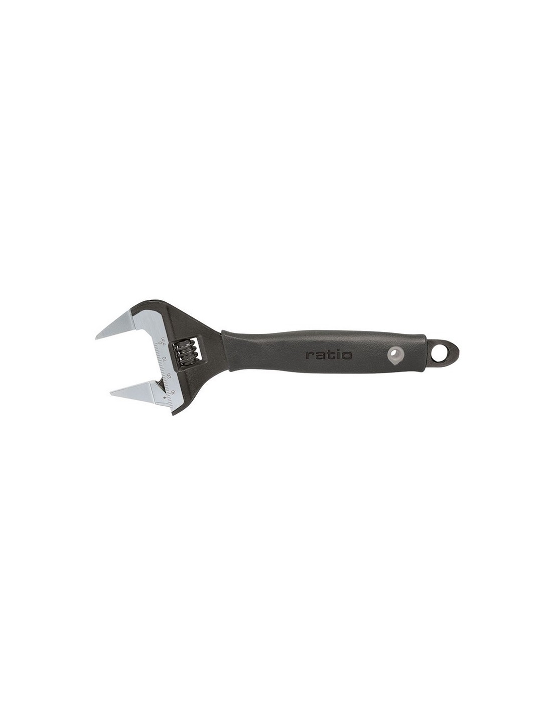 Llave graduable gran abertura y bocas finas RATIO 7093 Acero cromo-vanadio fosfatado negro. Escala milimétrica. Apertura +50% según modelo. Bocas +30% más largas que una llave normal. Empuñadura ergonómica antideslizante. 8\". 200 mm.