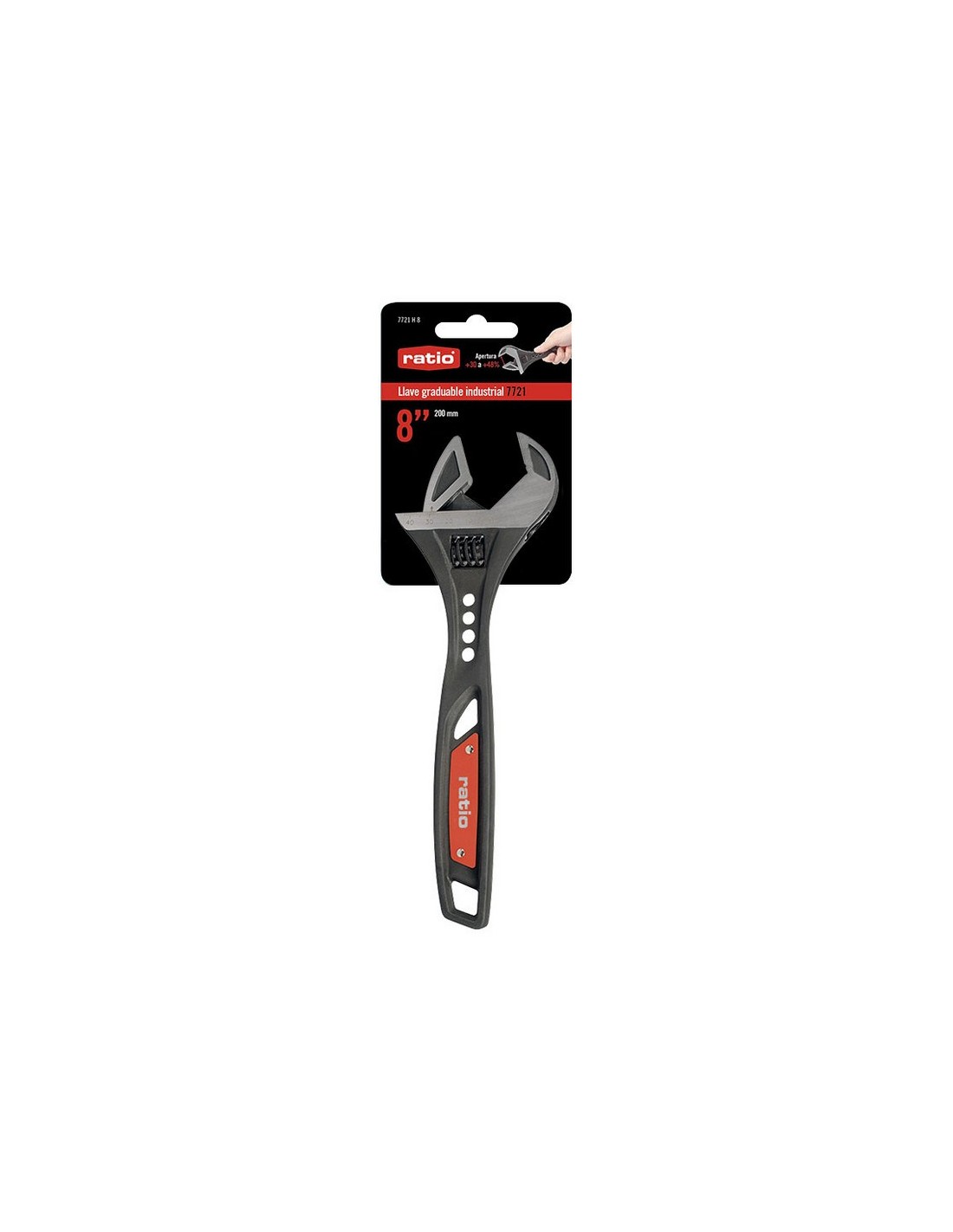 Llave graduable gran abertura RATIO 7721 Acero cromo-vanadio fosfatado negro. Escala milimétrica. Abertura +48% según modelo. Bocas +30% más largas que una llave normal. Cabeza con ángulo industrial de 15º para usar en áreas pequñas. Mango reforzado, permite transmitir alto par de apriete (+50%). Husillo oculto uso en espacios estrechos. 10\". 250 mm (métricas M2 - M24).