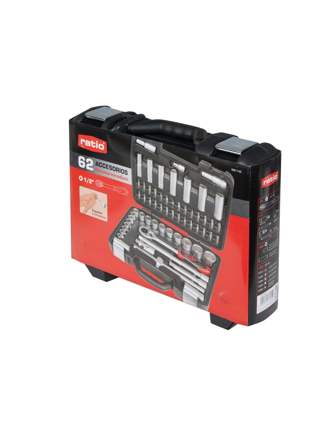 Maletín 62 herramientas RATIO. Acero cromo-vanadio satinado. Vasos 1/2" con sistema de bloqueo Locksystem. Composición: